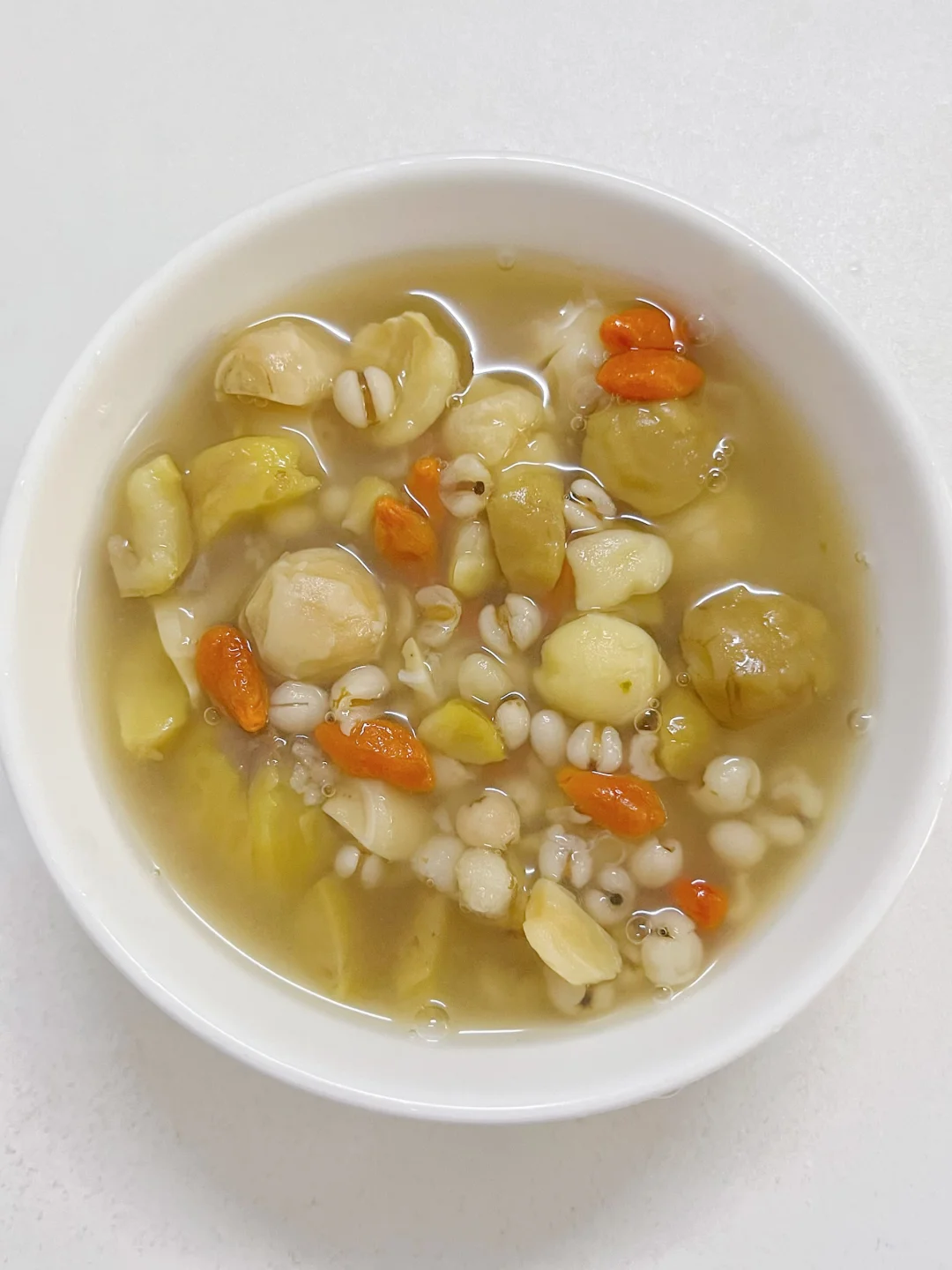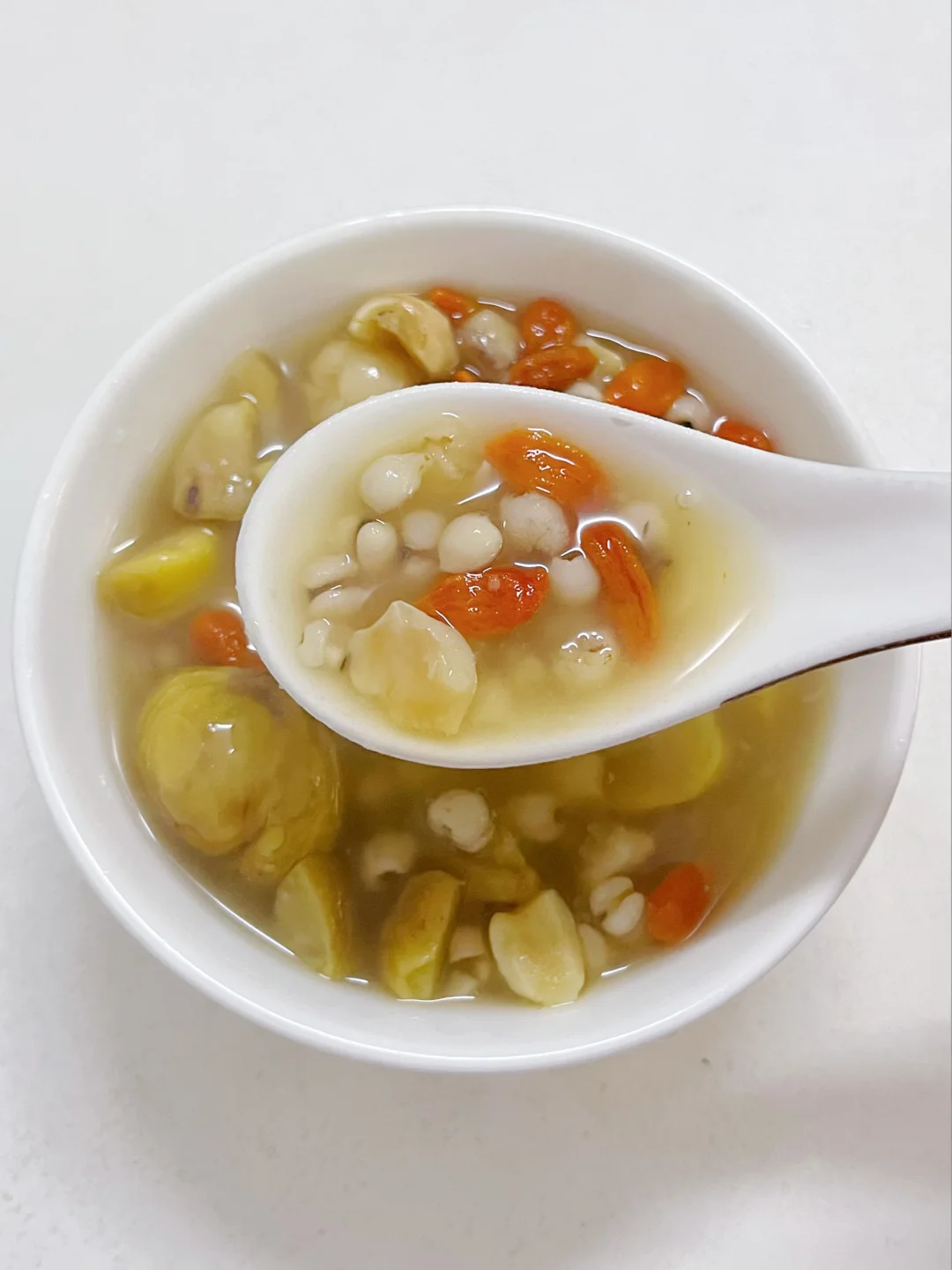 薏米祛湿,莲子养月卑胃,板栗补气,枸杞明目,冰糖润燥,搭配起来温和不寒凉。