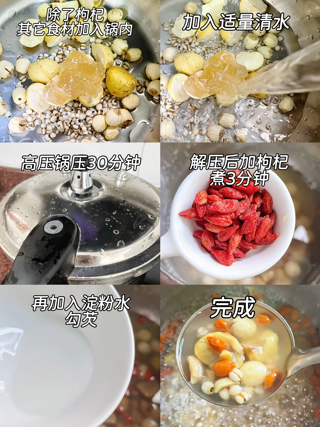 3️⃣ 放气后加枸杞再煮3分钟,淀粉水勾薄芡即可