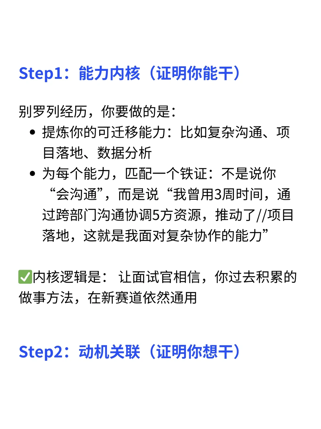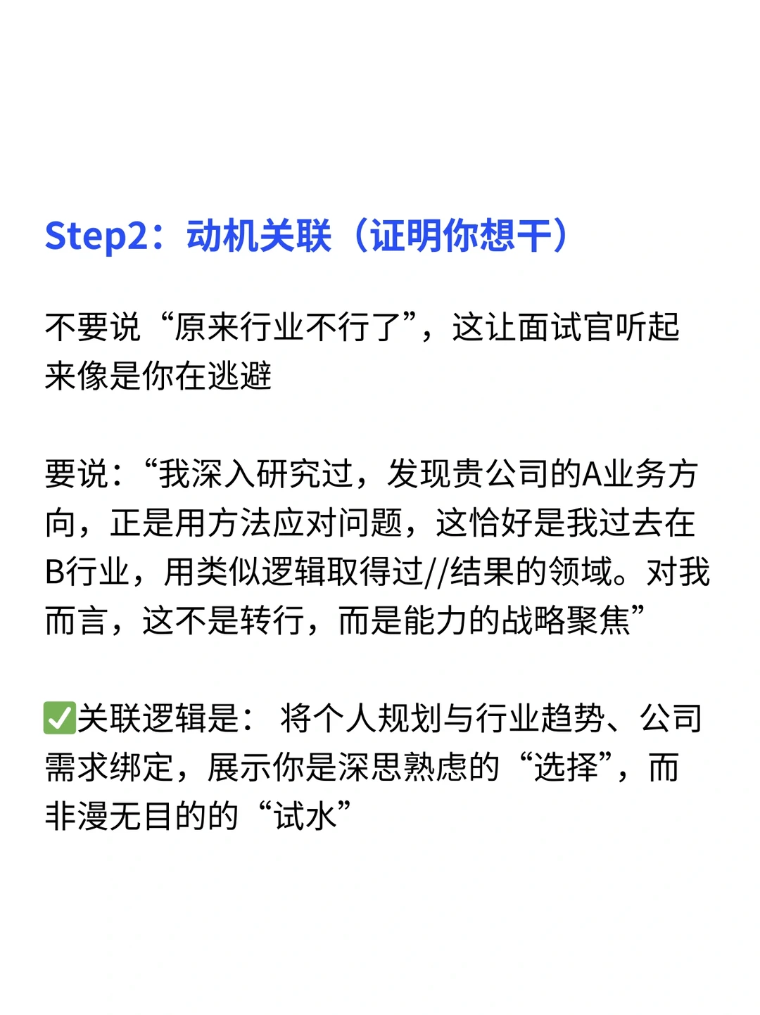 ✅要说:“我深入研究过,发现贵公司的A业务方向,正是用方法应对问题,这恰好是我过去在B行业,用类似逻辑取得过//结果的领域。对我而言,这不是转行,而是能力的战略聚焦”