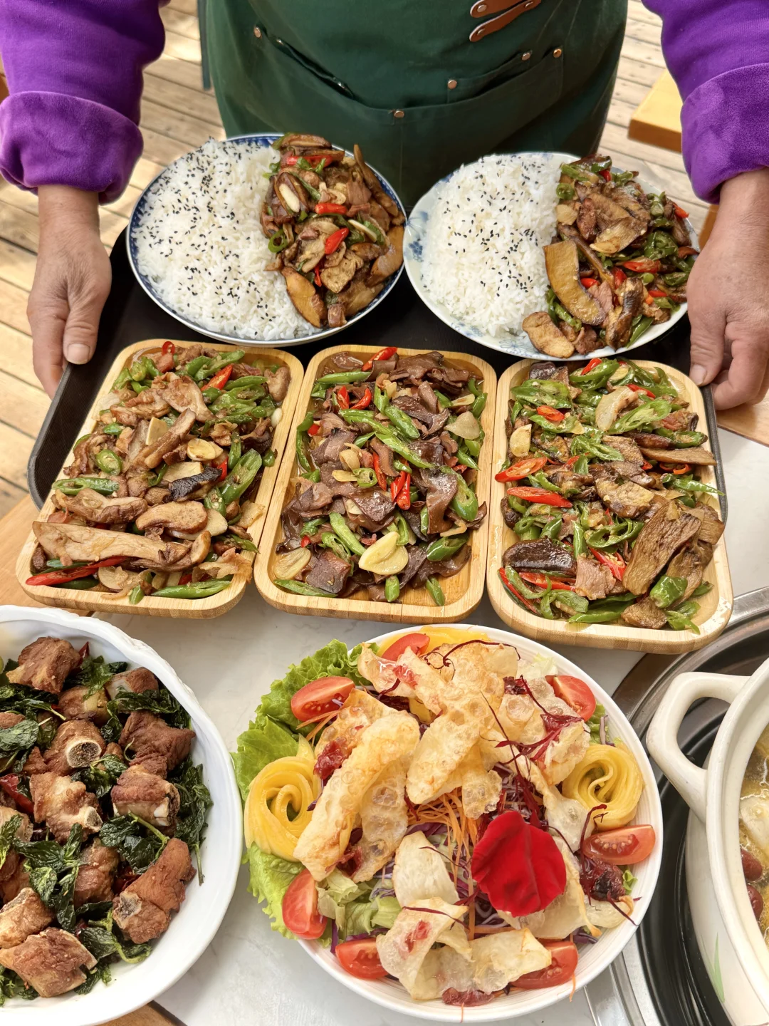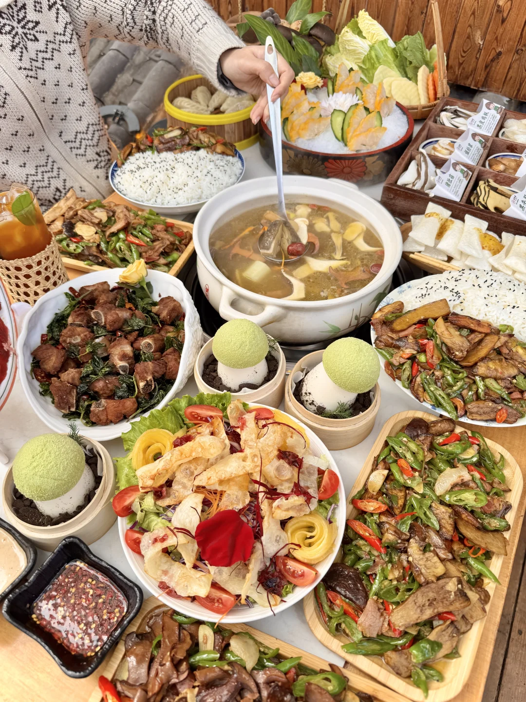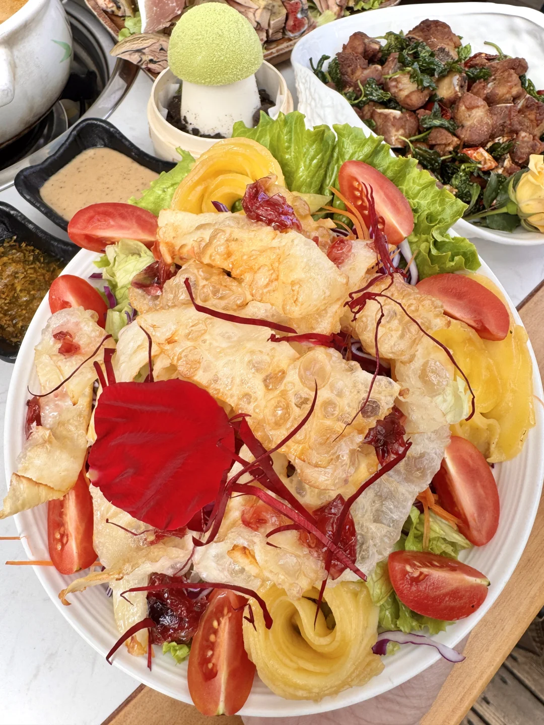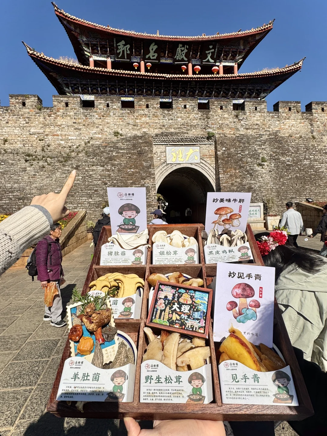 在大理古城南门附近,吃了无数次的老店!! 基本来大理的旅游姐妹第一顿都是去这里! 非常适合休闲的逛街吃喝一站式旅游~ 没想到能吃到见手青盖饭🥹🥹爆炒的好香啊! 菌子肥厚炒的很有食欲!搭配肉片、青红椒、和米饭拌在一起一口吃下去太香了!!碳水星人好爱… 还有水果乳扇沙拉、蘑菇奶冻、金耳刺身、蜂蜜饵块等各种云南大理特色小吃甜品!! 记住这个店名:滇师傅。