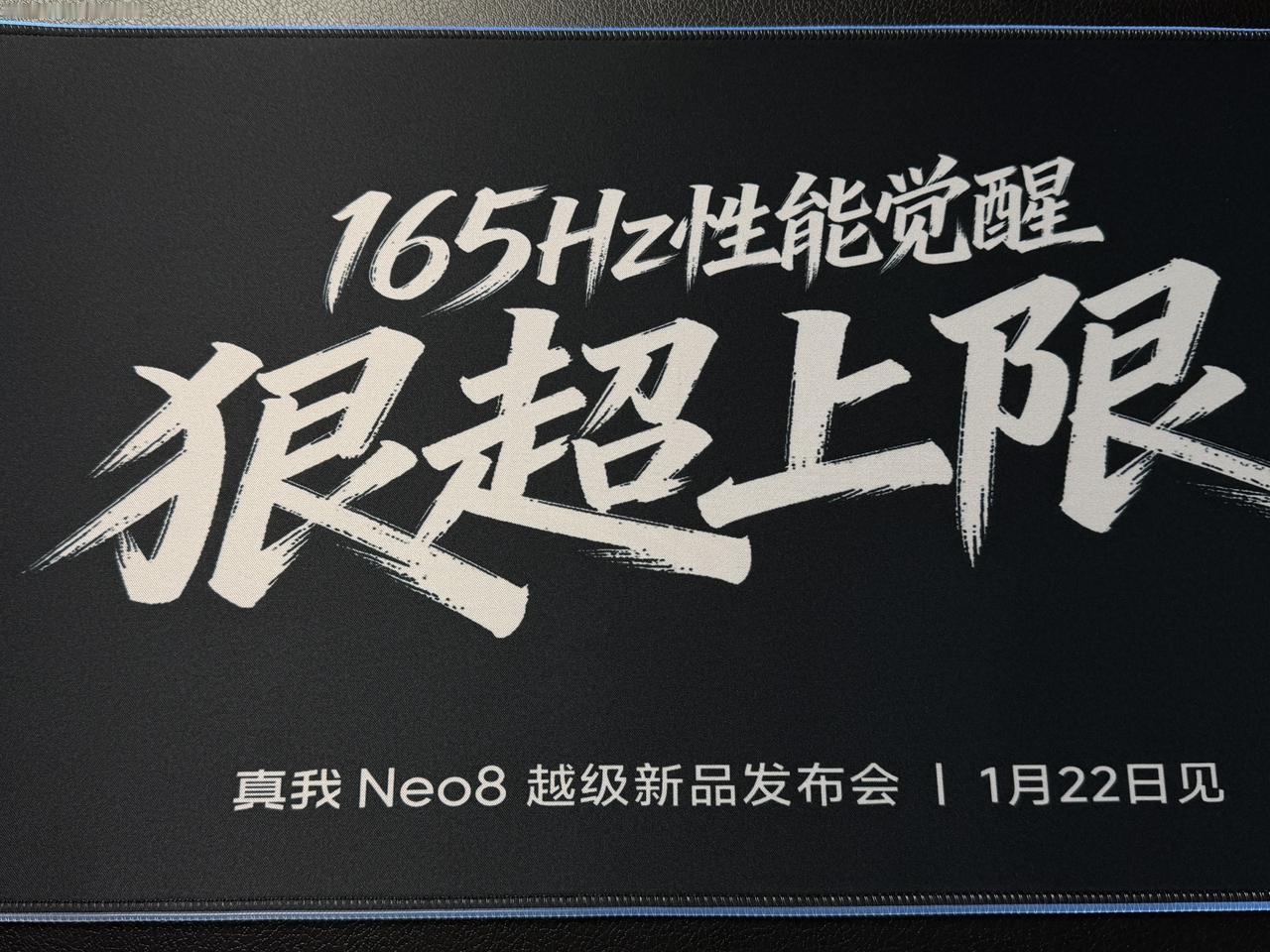收到了真我Neo8邀请函,有点意思。 是一个一圈RGB灯的鼠标垫,亮点直接印在鼠标垫上。“165Hz性能觉醒,狠超上限”,22号见。咱们到时候好好聊聊这款回归之作!