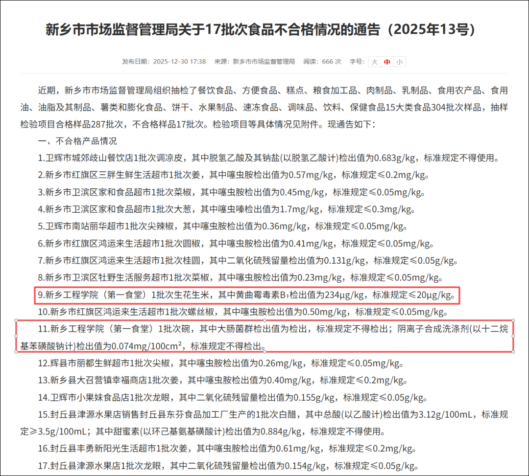 近日,新乡市市场监督管理局在2025年12月30日发布17批次食品不合格情况的通告,新乡工程学院(第一食堂)涉及2个批次、3项内容。