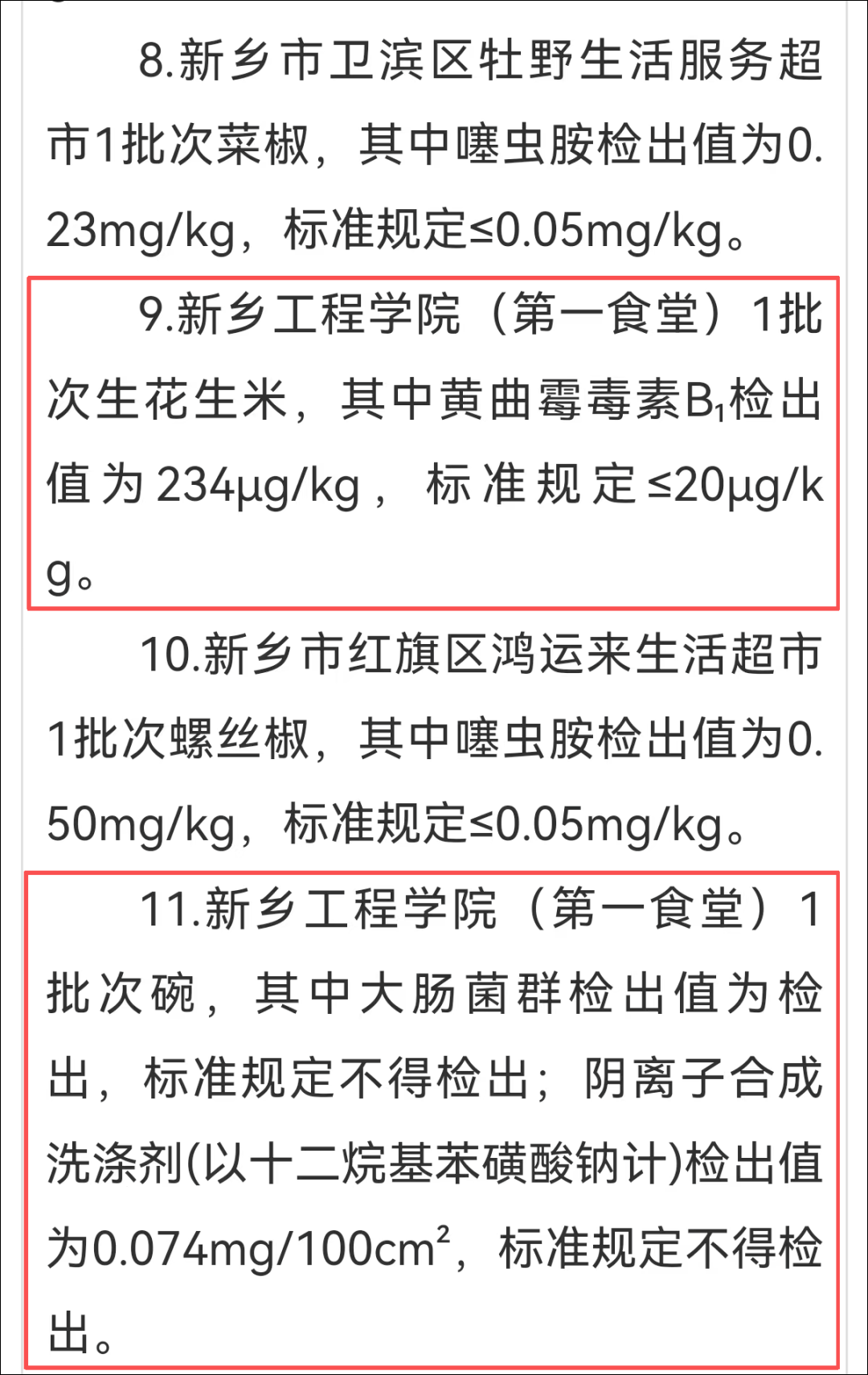 一、事情基本情况2025年11月27日,新乡市市场监督管理局对我校第一食堂开展食品安全抽检,抽检范围涵盖餐具、食材、调味品等关键品类共10种。2025年12月30日,新乡市市场监督管理局通告我校抽样生花生米黄曲霉毒素超标,抽样碗具检出大肠菌群。其他抽检的豆芽、辣椒、大白菜、胡萝卜、盘子、肉包子、素包子以及鸡骨味素精粉调味品均合格。
