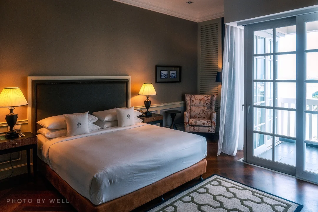 酒店客房分为遗产翼和胜利翼,房间都很宽敞,客厅、卧室和浴室三部分分离,装潢充满英伦风情,配备爪足浴缸和双洗手台设计。我们入住的套房还拥有私人天台,站在阳台安达曼海的湛蓝海水一览无余,黄昏时分,夕阳将海面染成金色,椰影婆娑,景色如画。