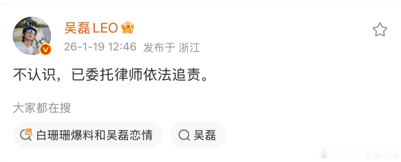 白珊珊艾特吴磊后,吴磊本人回应“不认识”。 此前,白珊珊大号爆料恋情,引发热议后,白珊珊大号无了,于是用小号质问吴磊。吴磊 不认识