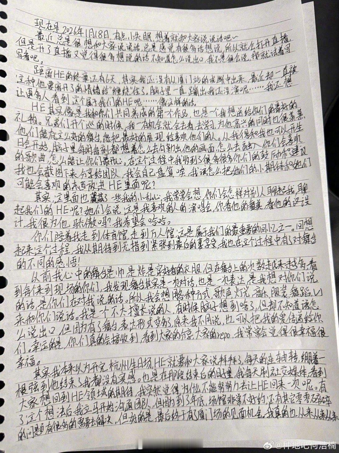 何浩楠给粉丝的手写信 好的关系,是互相成就,也是好好告别。何浩楠用这封信,为他和HE的这段旅程赋予了最郑重的仪式感。他不逃避结束,而是选择用最真诚的方式去面对,去感谢,去期待一个圆满的句点。这样的担当和温柔,真的太戳人了。