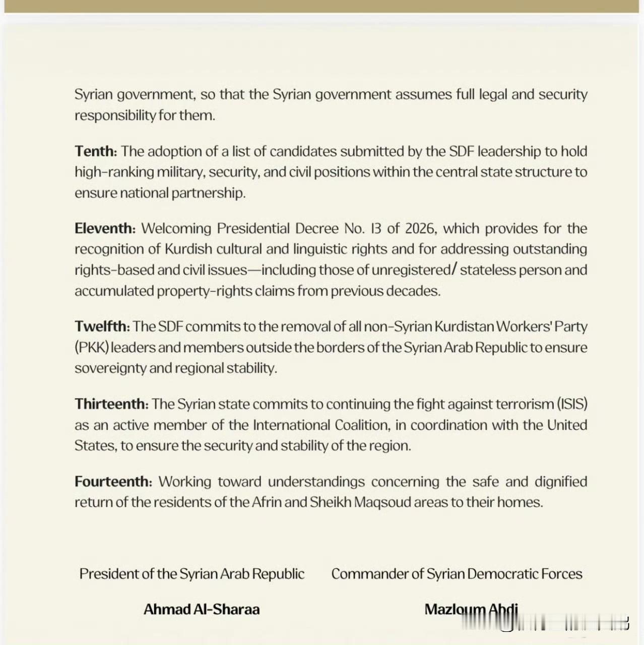 #叙利亚局势# 叙利亚恐怖组织HTS与叙利亚民主委员会(库尔德)协议核心条款 所有民事机构全面并入叙利亚国家体系。 将境内所有油田的控制权移交叙利亚政府。 经安全审查通过后,叙利亚民主委员会成员以个人身份而非建制部队或旅级单位的形式加入叙利亚国防部,同时叙利亚政府需为库尔德地区提供相关保障。 颁布总统令,任命哈塞克省省长。 从艾因阿拉伯撤出重型武器,并组建由叙利亚内政部指挥的地方安全部队。 叙利亚政府接管关押 “伊斯兰国” 恐怖组织成员及其家属的监狱与拘留营,并承担管理责任。--注:近两日HTS武装人员在其攻占多处库尔德控制区后,打开监狱释放了数百名ISIS恐怖分子 批准叙利亚民主委员会提名的候选人,任职于叙利亚国家机关。 叙利亚民主委员会承诺将库尔德工人党相关人员驱逐出叙利亚境内。 叙利亚国家承诺持续开展打击 “伊斯兰国” 恐怖组织的行动。 推动相关协议达成,助力流离失所者重返阿夫林与谢赫马克苏德地区。 #伊朗局势#