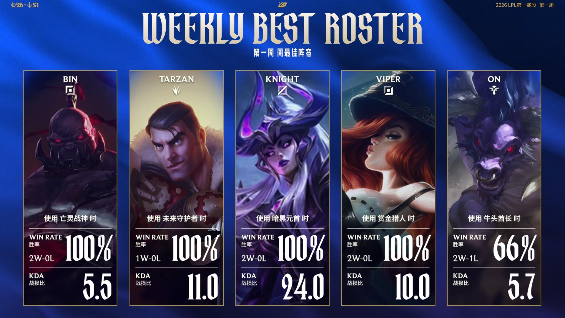 虎扑01月19日讯英雄联盟赛事官方公布2026LPL第一赛段周最佳阵容—组内赛阶段Week1: