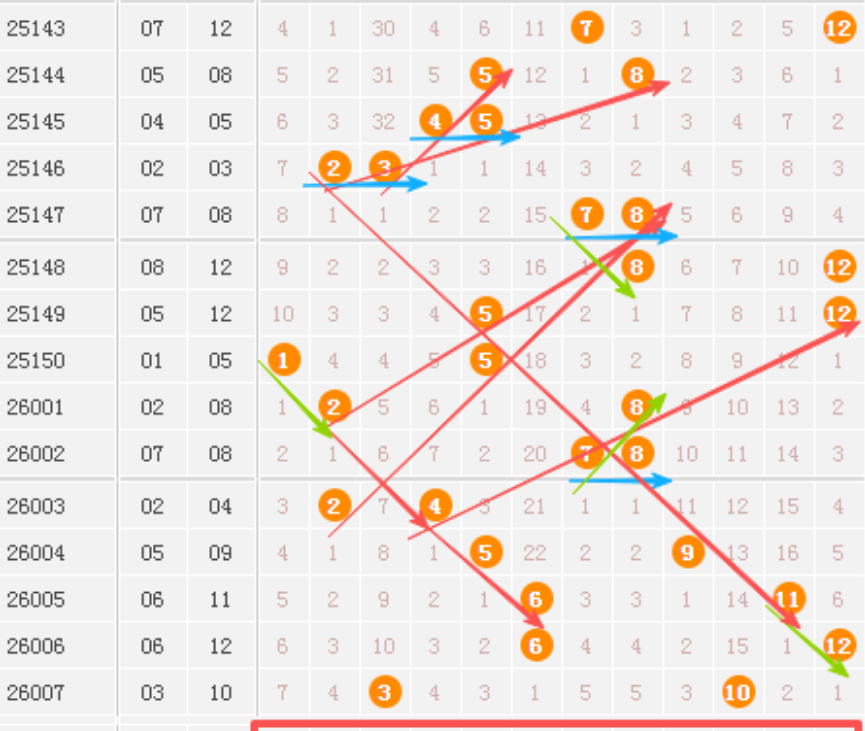 大乐透26008期走势图的画线浅析,上期3+2,本期看好5+2。 上期开出来的号码是1、3、13、20、26,区间比是2:2:1,大小比是2:3。已经连着3期都是221这个区间比了,这是在回补历史30期内的走势。上一次同样的走势连着出现三期,是在25143期到25145期,也是连续三期区间比一模一样。 上期一区补了1和3这两个号码。在历史走势里,这两个号也一起补过,而且在25128期到25132期的时候,龙头号还相互补过呢。(这里有个共同点,就是1和3作为龙头号补完之后,下一期龙头号基本会补个偶数,而且是热号居多,这期咱们得防着点)。 二区上期补了13和20这俩号码。从历史走势看,13出现的次数比较多,但间隔期数没超过10期,还有啊,下一期基本也是补偶数。20在近30期里就补了3次,和它连着出现的号码是16和25,这期也得防着点。 三区补了一个号26,这算个冷号。从近30期的走势看,26经常和28一起出现。 上面说的这些共同点,咱可以当成这期选号的参考,主要还是按常规方法选号,再用防守选号做个辅助。