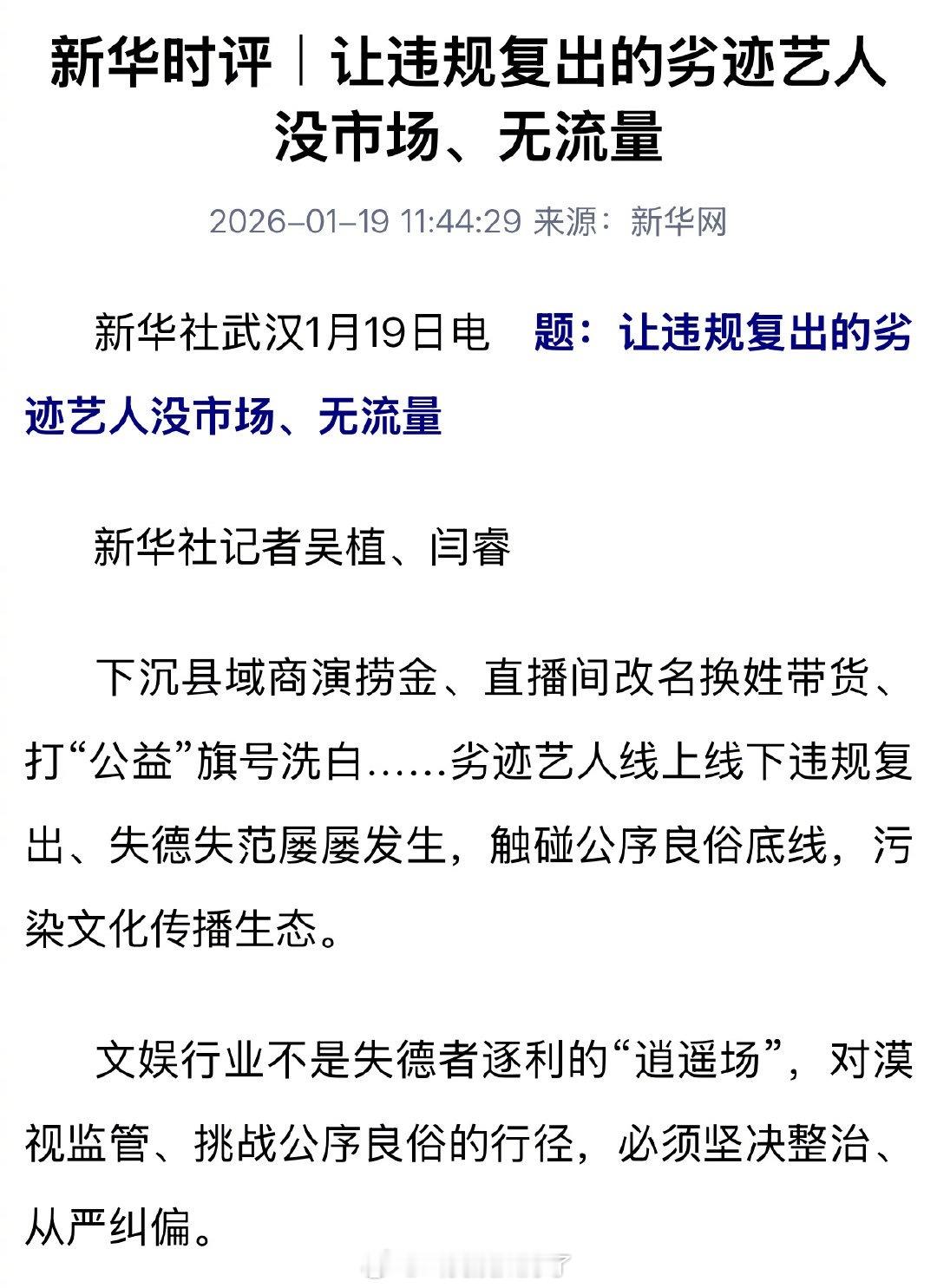 官媒下场发言:让违规复出的劣迹艺人没市场、无流量。