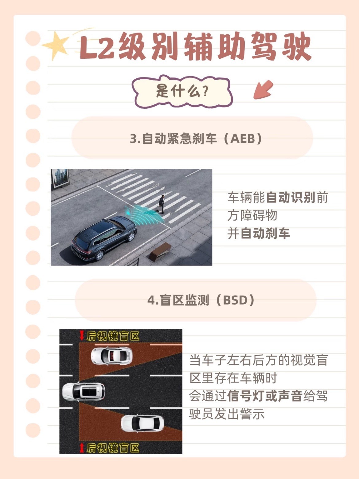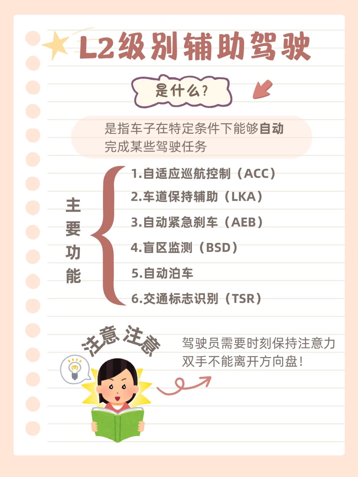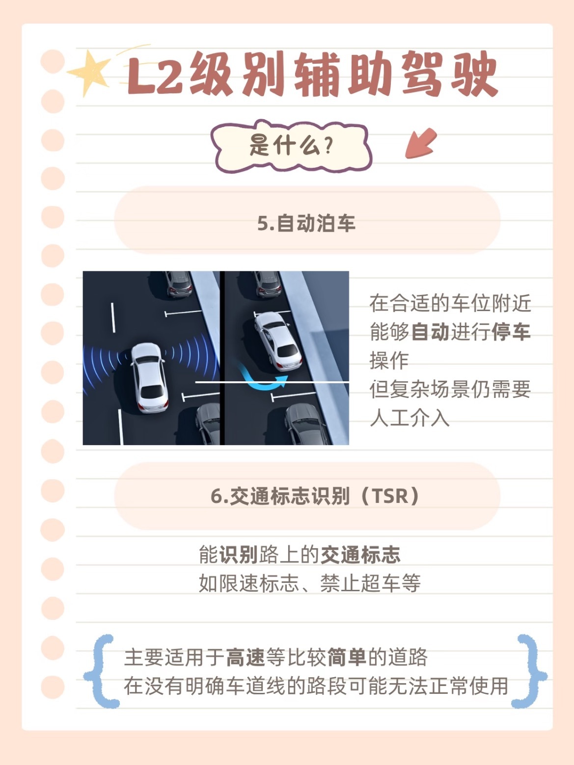 现在的新车动不动就说自己有“L2级辅助驾驶”,它到底能干什么?又有什么不能做?🚗🔹 L2是什么?它是在特定条件下,能同时控制车速和方向的辅助系统,但驾驶员必须全程监控,随时准备接管。双手别离方向盘!📋 核心6大功能:1️⃣ 自适应巡航(ACC)2️⃣ 车道保持(LKA)3️⃣ 自动紧急刹车(AEB)4️⃣ 盲区监测(BSD)5️⃣ 自动泊车6️⃣ 交通标志识别(TSR)💡高速或快速路巡航时能大幅缓解疲劳,但城市拥堵路段体验可能不尽如人意。安全底线永远在自己手里汽车大v聊车
