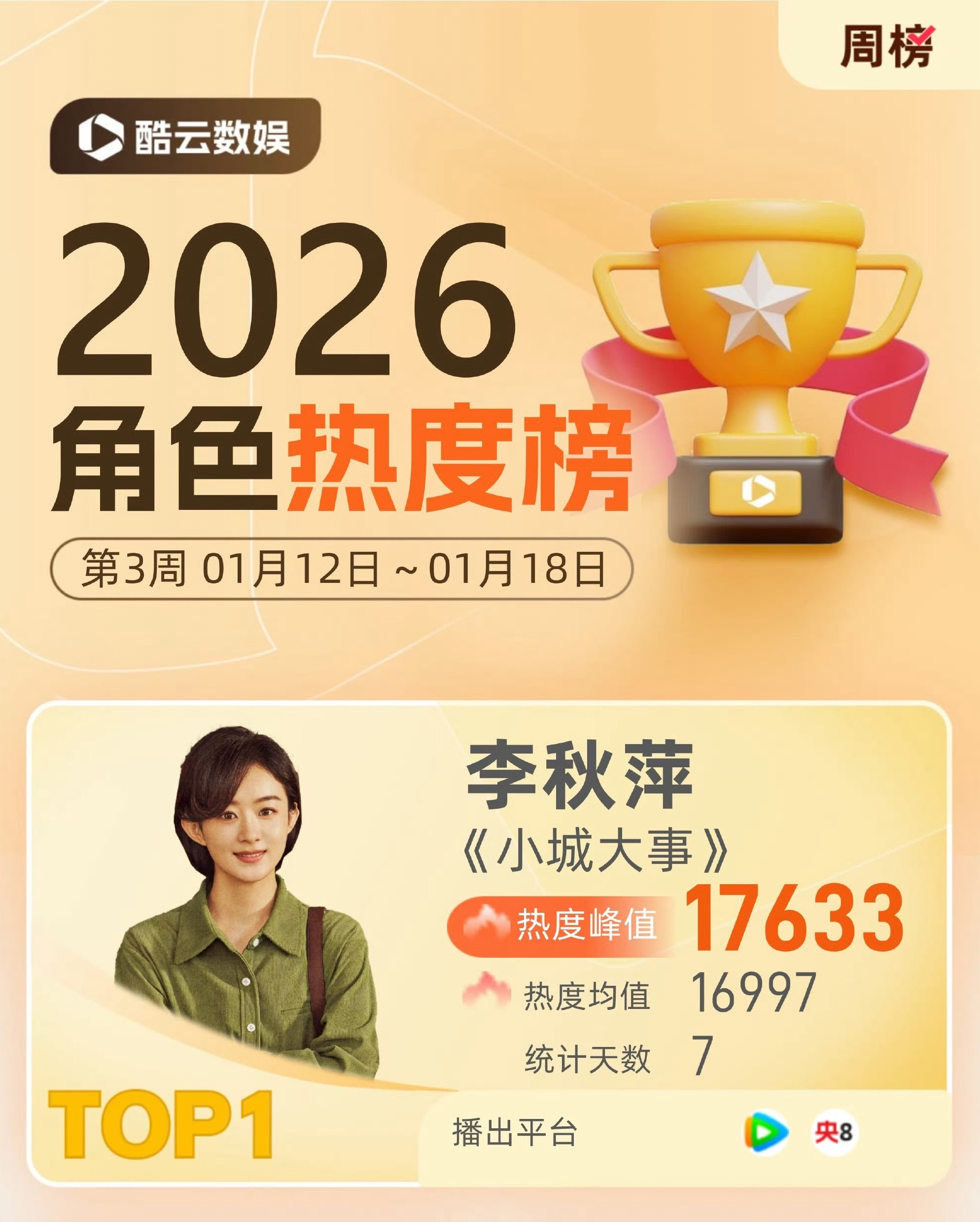 恭喜赵丽颖小城大事酷云收视率周榜排名top1❗️李秋萍角色热度蝉联周榜冠军,人民