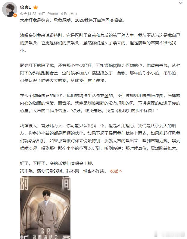 徐良官宣巡演全体注意!青春召集令已发出!从校园广播到万人体馆,我们用了整整一个青春来赴这场约。这次,不做耳机里的独行者,要做现场的沸点!备好嗓子,清空烦恼,让我们把过去的单曲循环变成当天的万人大合唱!抢票手速准备!这一次,我们的回忆,必须全场大声!