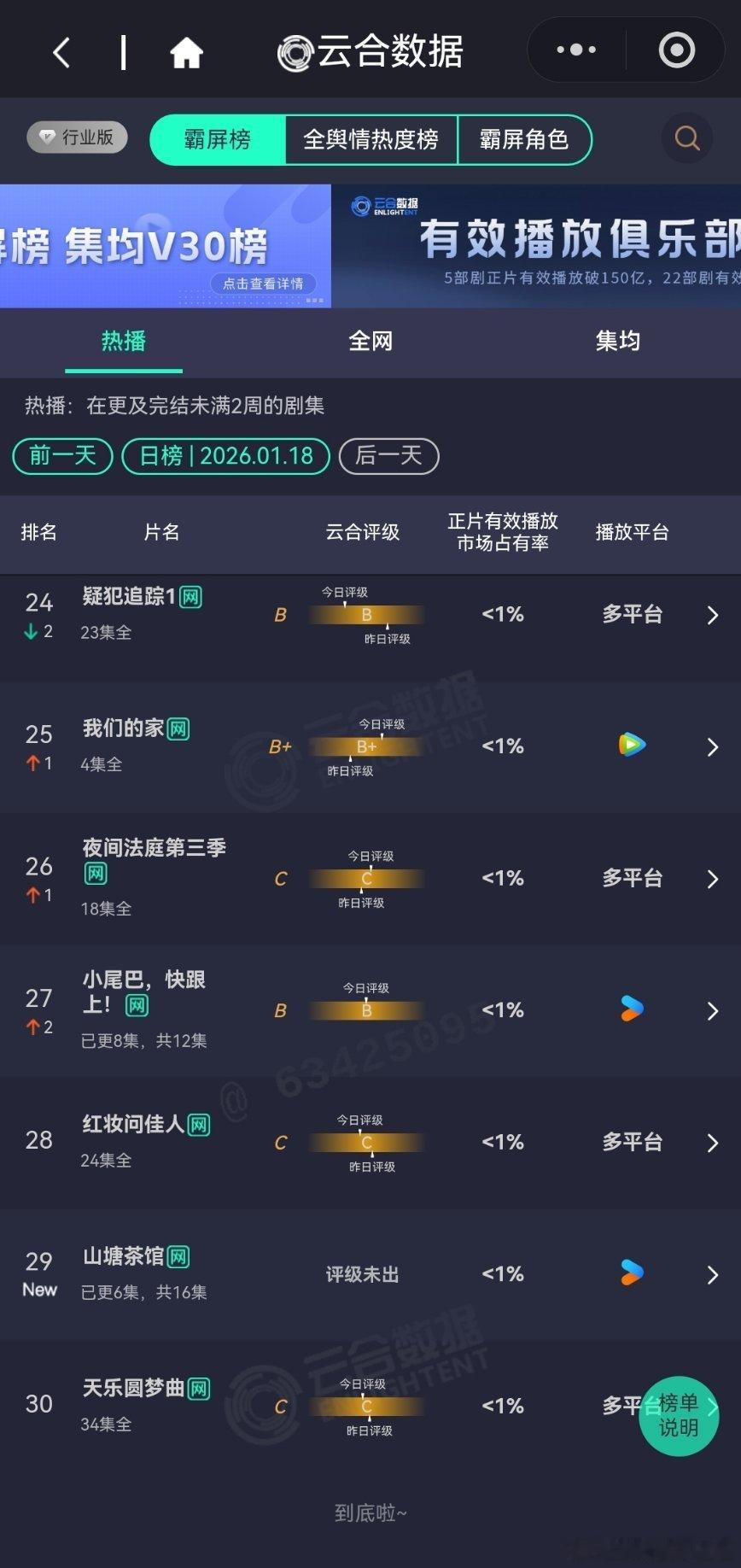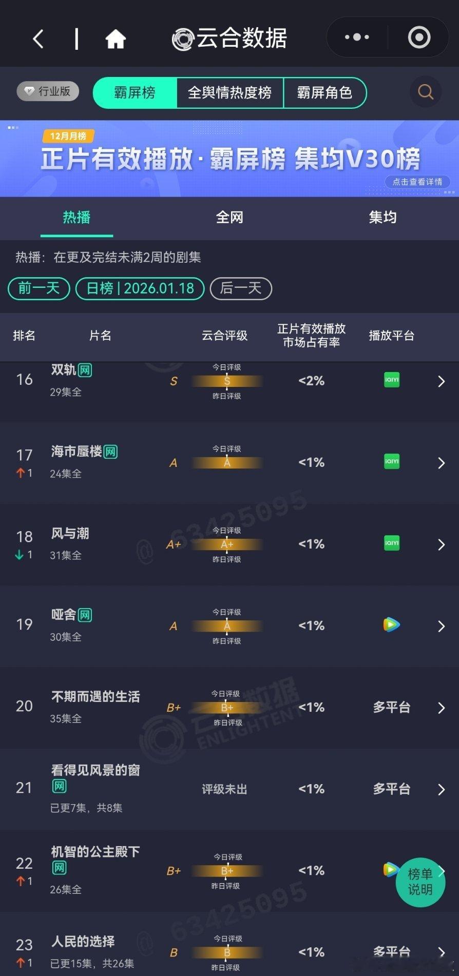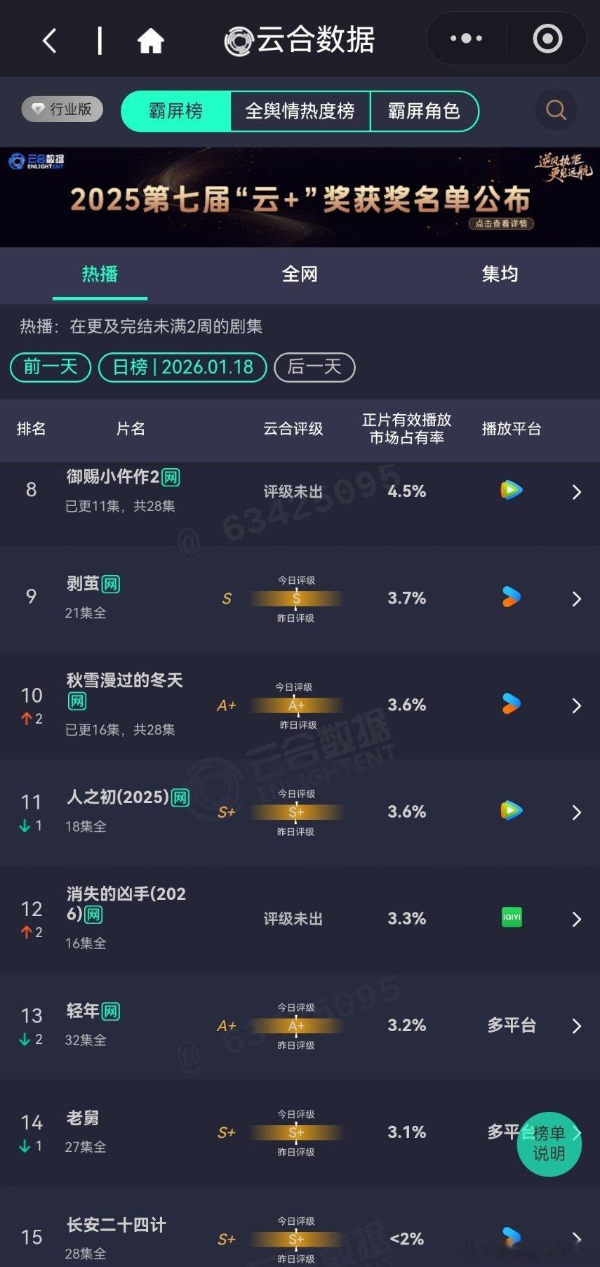 2016年1月19日云合播放占比云合 罚罪2 18.8%轧戏11.3%可惜男女主讨论度反而没有配角高,不过实绩还是有了。小城大事10.5%,扑得不想看它的数据了。玉茗茶骨9.9%评级略有下降,看看后面能不能稳住吧御赐小仵作2 4.5%按照目前的趋势S都有点危险了。