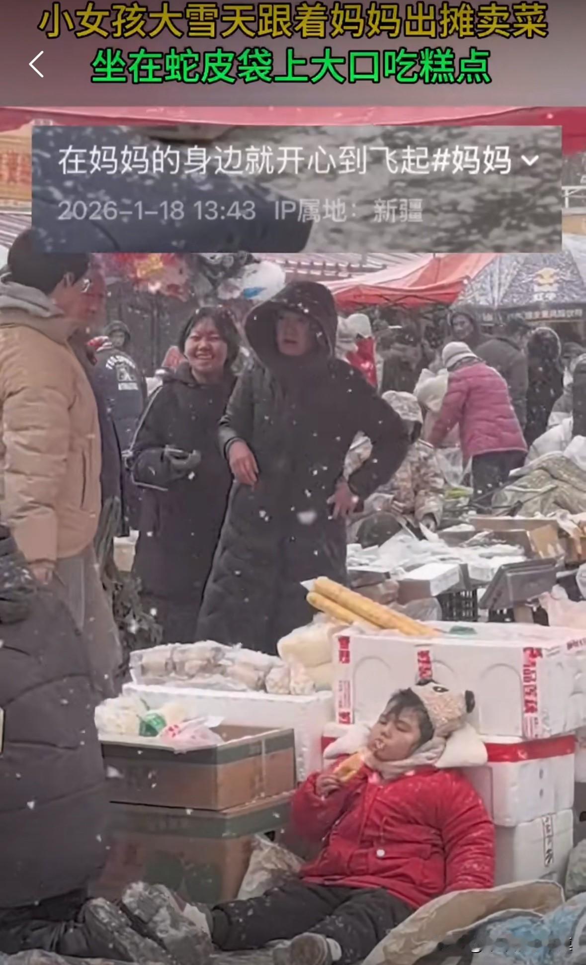 女孩下雪天跟着妈妈一起出门摆摊卖菜,妈妈买菜,女孩坐在蛇皮袋上吃着零食! 生活虽然不易,但是只要跟在妈妈身边就幸福感爆棚! 也很佩服这位妈妈,不管生活多艰难,都毅然决然的把孩子带在身边。街边卖菜