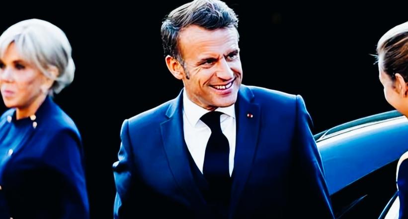 马克龙和妻子布丽吉特的表情形成了鲜明的反差啊! 马克龙和身边工作人员在热聊,满脸