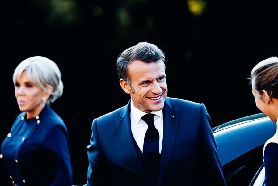 马克龙和妻子布丽吉特的表情形成了鲜明的反差啊! 马克龙和身边工作人员在热聊,满脸的笑容! 布丽吉特一脸严肃,站在一旁不知在思索什么事情呢? 马克龙和工作人员在聊什么呢?这么开心啊!