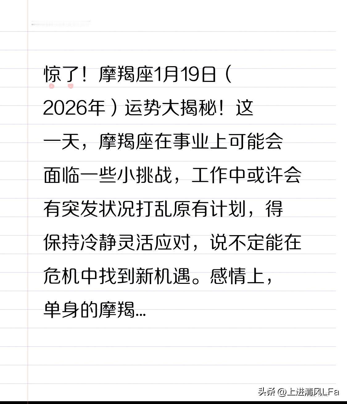 惊了!摩羯座1月19日(2026年)运势大揭秘! 这一天,摩羯座在事业上可能会面临一些小挑战,工作中或许会有突发状况打乱原有计划,得保持冷静灵活应对,说不定能在危机中找到新机遇。 感情上,单身的摩羯有机会遇到让自己心动的人,勇敢主动点,脱单几率大增。有伴侣的摩羯,和另一半相处甜蜜,一起做些浪漫小事,感情会升温。 财运方面,可能会有意外小支出,但也有获得额外收入的可能,合理规划收支就好。这天整体运势有挑战也有惊喜,摩羯们冲就完事儿!