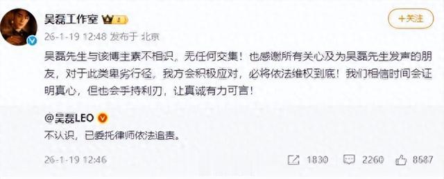 1月18日起,网友“白珊珊a”连发多条微博喊话吴磊。1月19日,@吴磊LEO发博回应:“不认识,已委托律师依法追责。”随后,吴磊工作室转评:“吴磊先生与该博主素不相识,无任何交集!也感谢所有关心及为吴磊先生发声的朋友,对于此类卑劣行径,我方会积极应对,必将依法维权到底!我们相信时间会证明真心,但也会手持利刃,让真诚有力可言!”