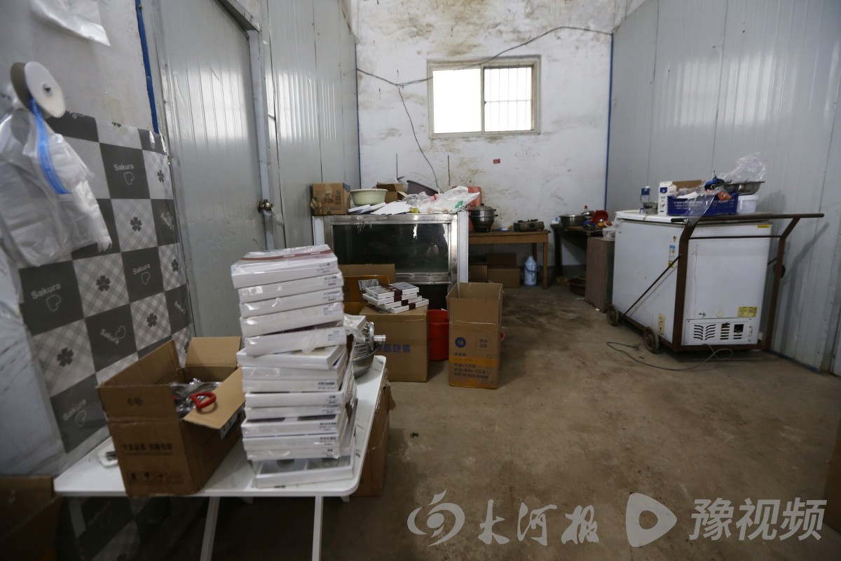 李安亮的蛋糕店在周口市西华县李大庄乡刘庄村,是三间平房组成的临路门面房。拉开蓝色的卷闸门,里面设施一览无余。靠北墙处是一台烘焙机,下面是搅蛋机,南墙附近放着一台发酵机,靠西的窗子前是工作台,其余地方散放着蛋糕包装盒、各种水果等。