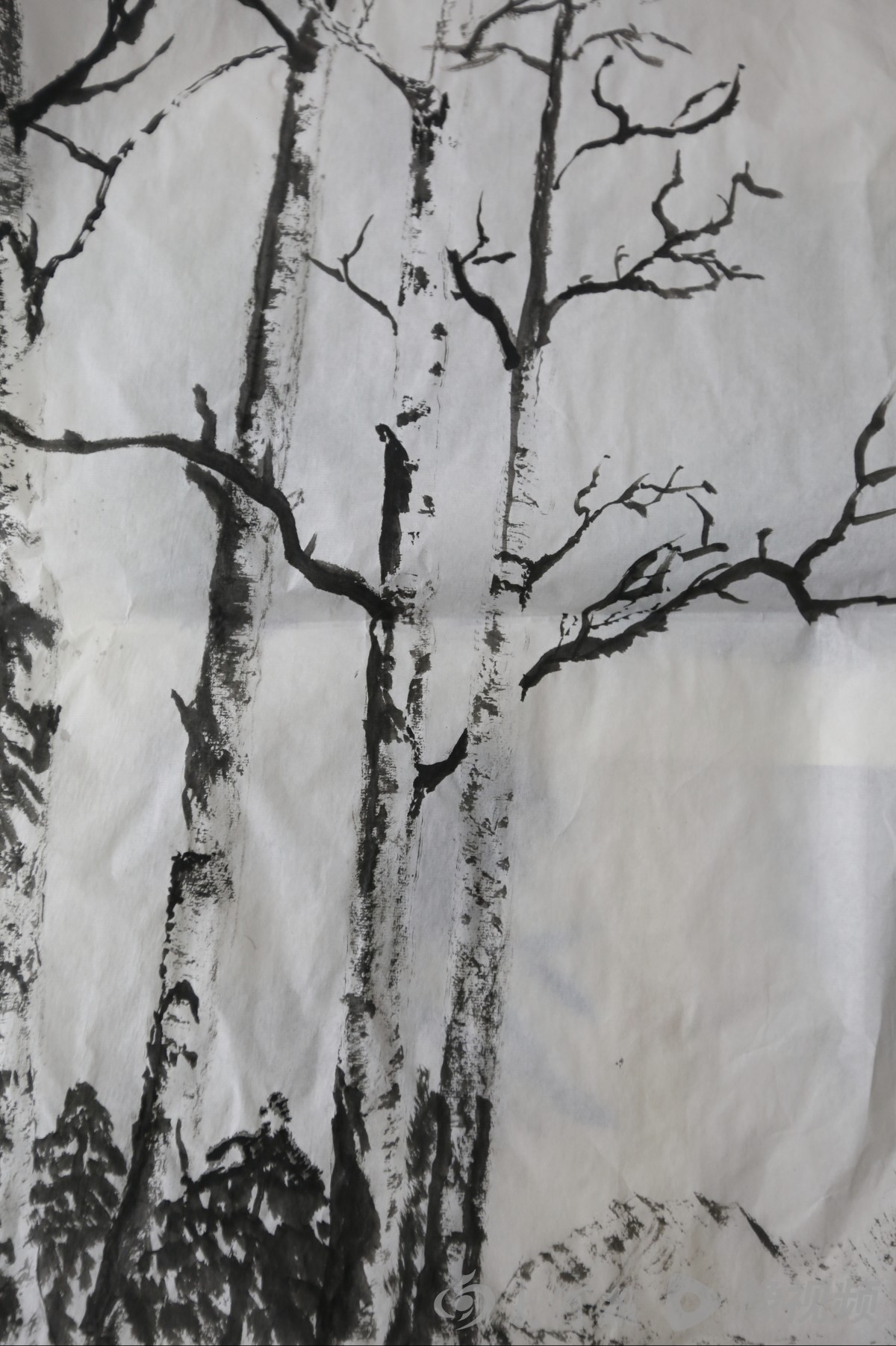 再比如,他寥寥数笔就可以勾勒出几棵老树的轮廓,挺拔的树干,苍劲的枝杈,黑墨白纸的色彩互补下,呈现出“枯藤老树”的诗意画卷。