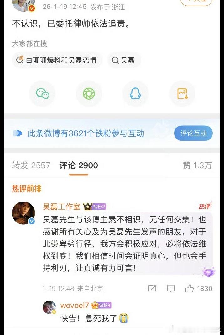 吴磊 白珊珊吴磊很刚,直接告的是源头诽谤,还有其他侵权造瑶传谣的也不少,也在取证当中。假嫂子很快滑跪,说被“盗号”,这口癖…吴磊真无妄之灾,纯文字的造瑶编造,造成的伤害是无法挽回的。我们正常人都会觉得这种造瑶严重,但某些群体不一定这么觉得,无道德底线的人是需要狠狠告,不然人人效仿,这个圈子还得了。吴磊起诉白珊珊诽谤侵权