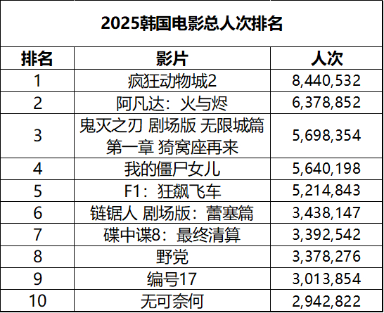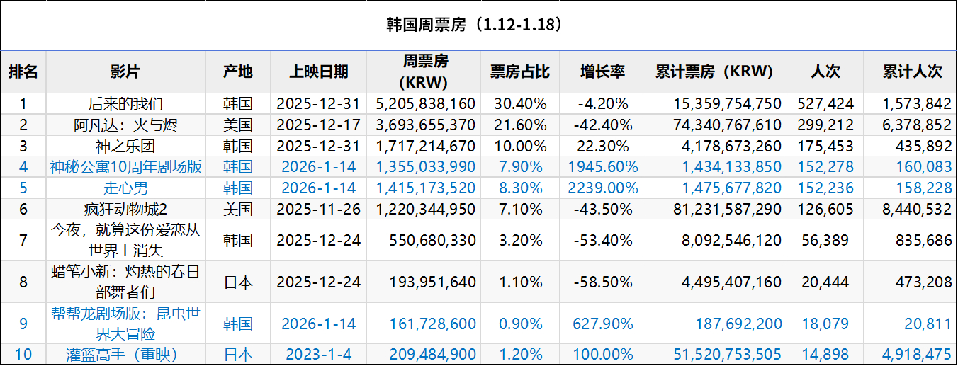 2026年第3周韩国票房 :1.《后来的我们》蝉联冠军,累计观影人次157万;2.《神之乐团》公映第三周票房继续逆跌,后劲很强;3.《神秘公寓10周年剧场版》在新片中成绩最佳;4.《灌篮高手》再度重映上榜。(数据:韩国电影振兴委员会)