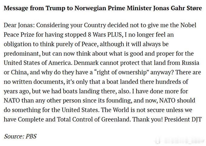 🚨特朗普致挪威首相的信函被曝光:“鉴于贵国决定不授予我诺贝尔和平奖,尽管我曾阻止了八场以上的战争,我不再觉得有义务仅仅考虑和平,尽管和平永远是首要的,但现在我可以考虑什么对美国有利和恰当的”“现在,北约应该为美国做些事情。除非我们完全控制格陵兰岛,否则世界是不安全的”