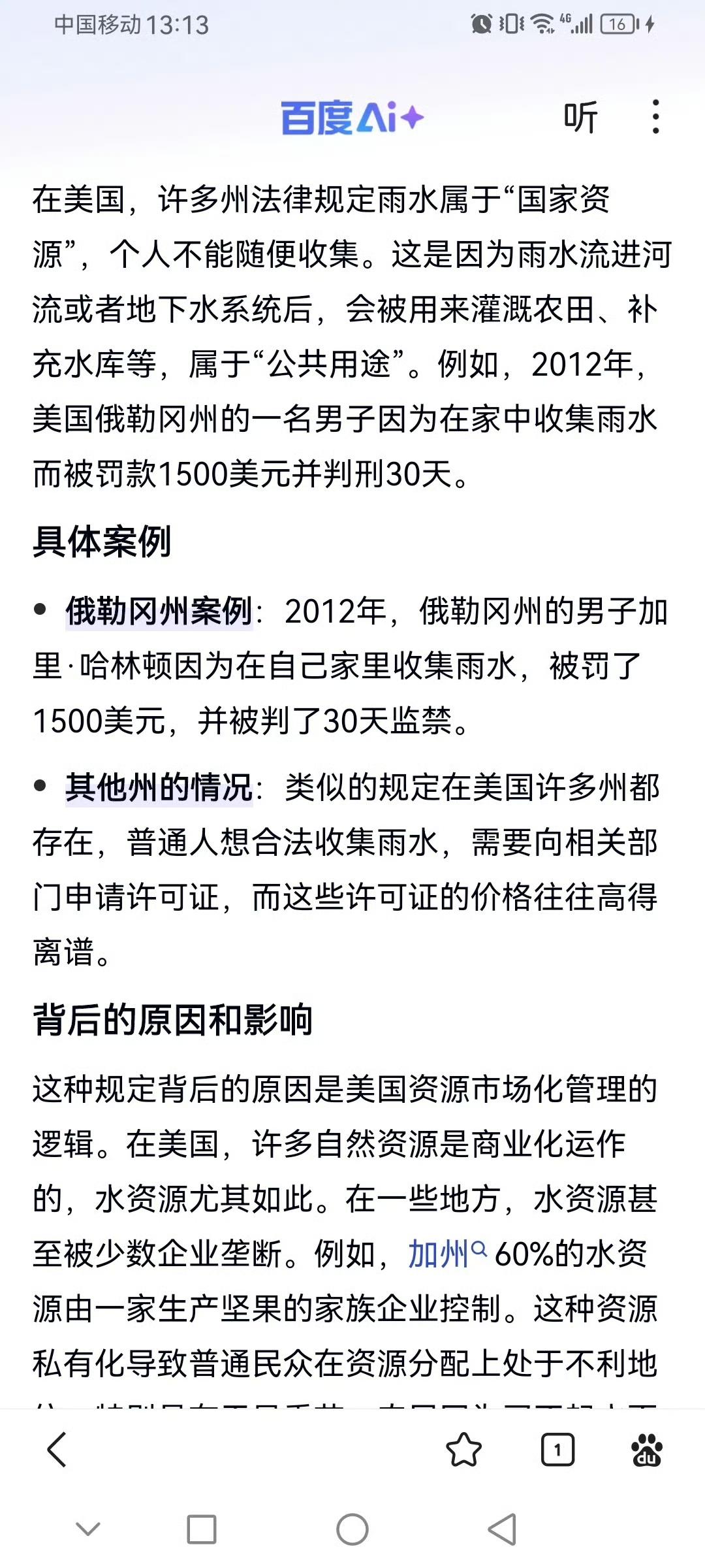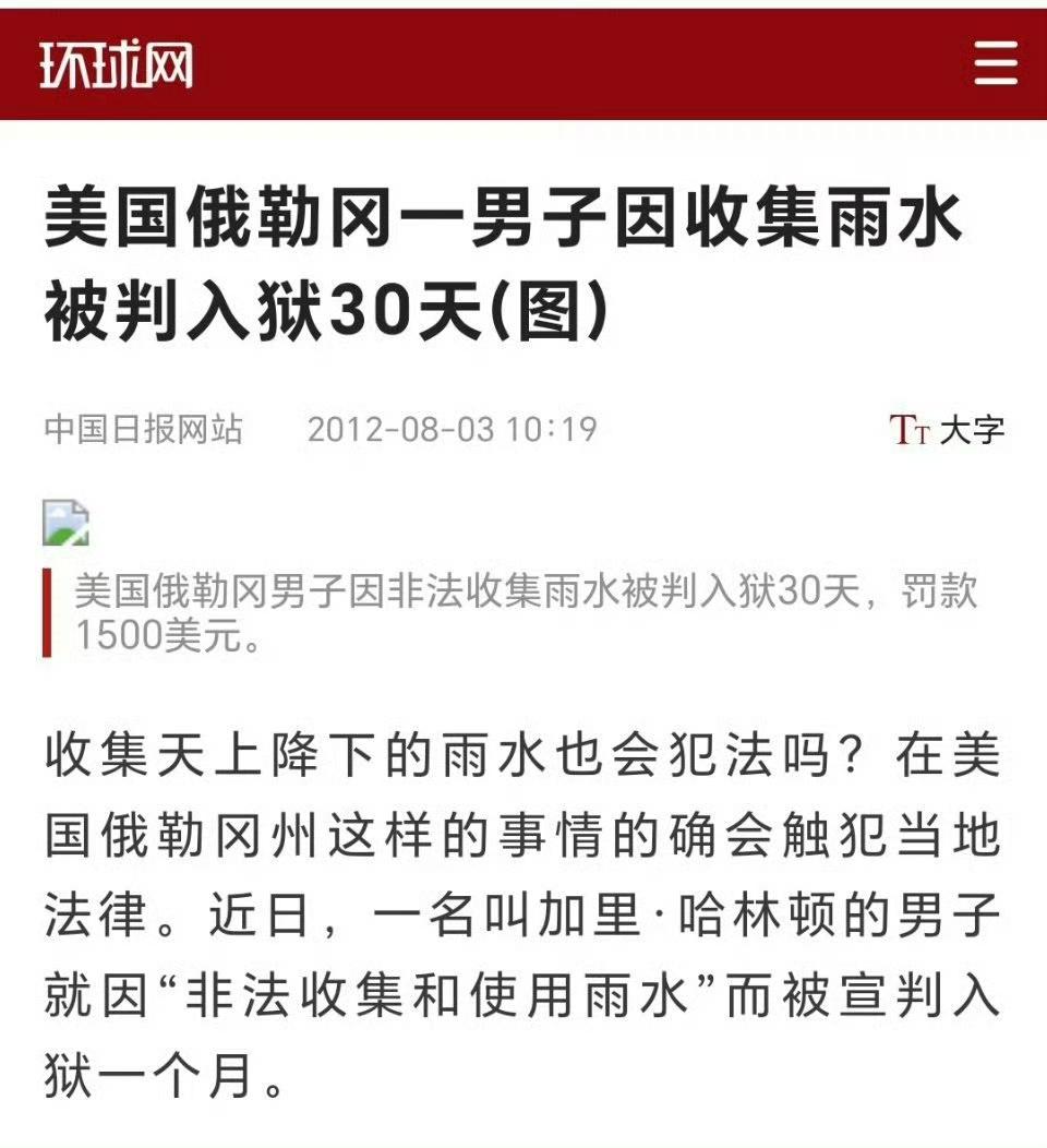 “在美国多数州,在自己土地上收集雨水是非法的。与此同时,在加利福尼亚州,两位亿万富翁却拥有该州 60%的水资源”。这是中美网友大对账时发的,当时他说不允许收集雨水,不允许养四只鸡,不允许自己种菜时,中国网友还不信… 水资源征税海外条友说 海外生活分享