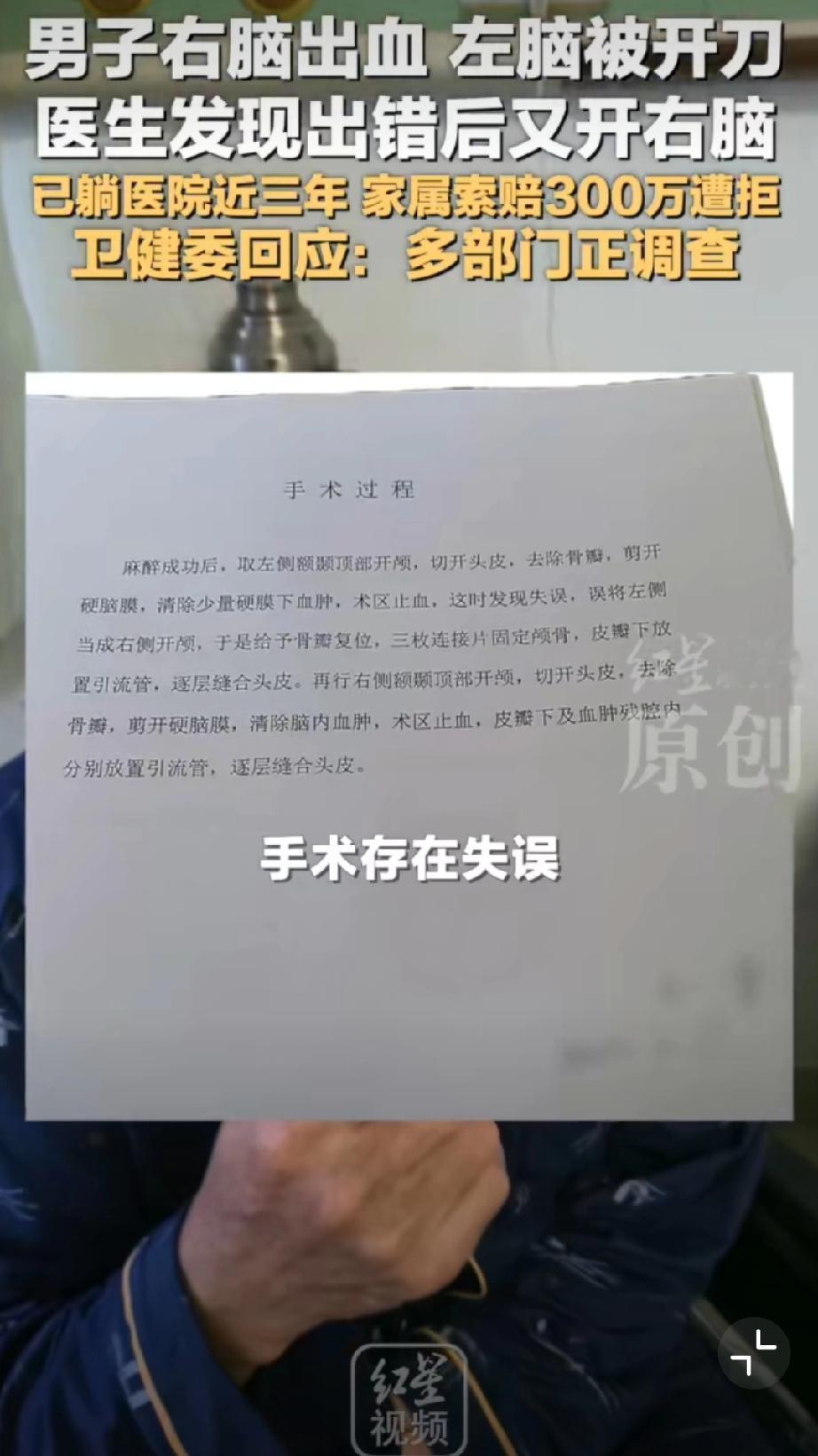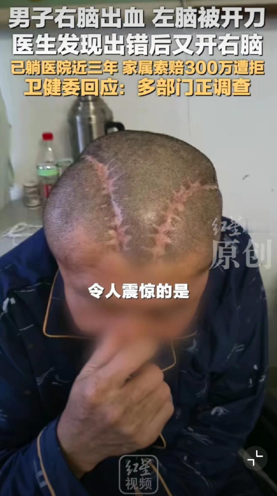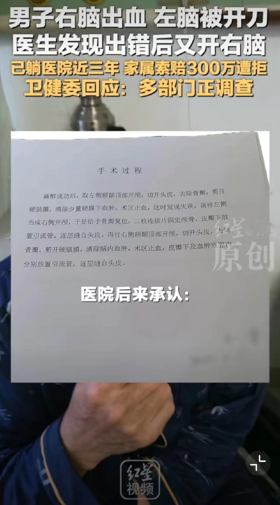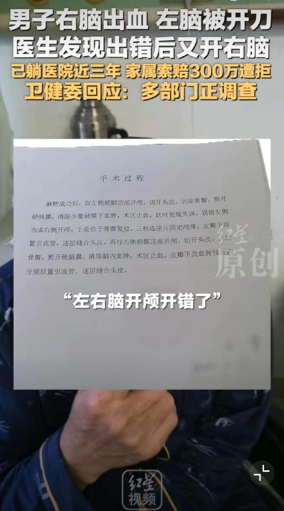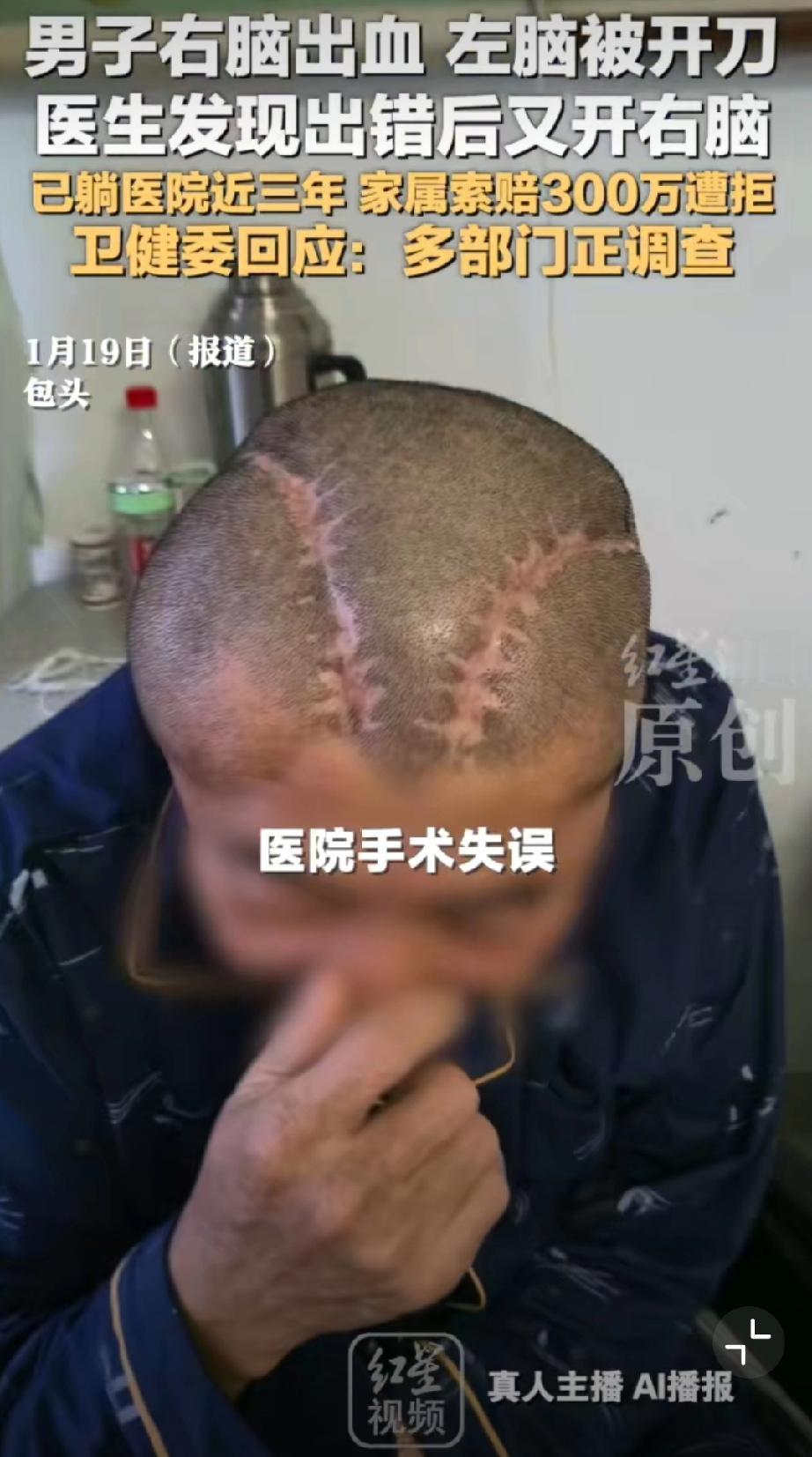 男子右脑出血被医生错开左脑[恐惧]这操作真的离谱到家!王先生右脑出血,包头市中心医院竟错开左脑,术后卧床三年至今没好转。医院承认失误却停了护工费,家属索赔还被拒,这也太不负责任了!希望卫健委严查到底,追究责任、足额赔偿,给患者和家属一个公道! 包头身边事 荒唐事件分享