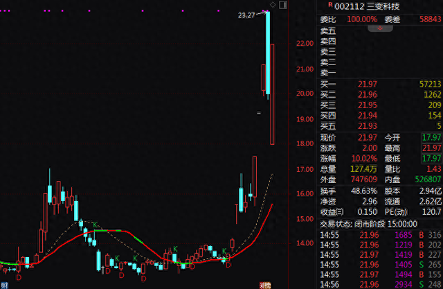 值得注意的是,三变科技(002112)今日早盘一度跌停,尾盘拉升涨停,上演“地天板”,成交额25.92亿元。今年以来,三变科技累计涨幅近66%。