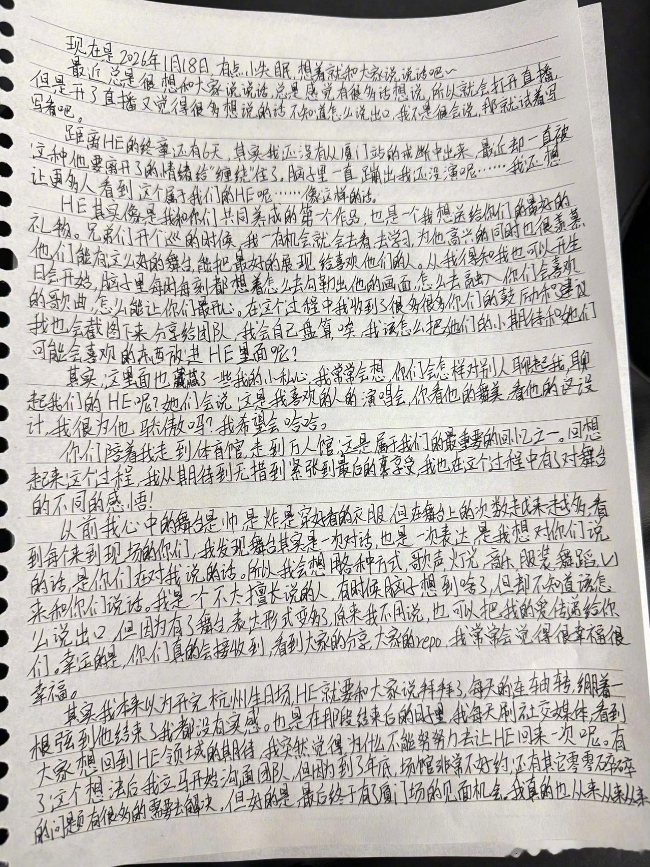 何浩楠给粉丝的手写信 是谁收到了的手写信!作为粉丝我们吃的也太好啦~HE收官在即,小何深夜发布给粉丝的手写信,字里行间都是对粉丝们的感谢和爱意,就这么真诚的小狗谁能不爱啊!HE能不能不要落幕,何浩楠能开一辈子吗!