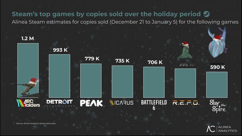 【16亿美元!Steam 12月收入创历史新高】据外媒merlininkazani统计,2025年12月,Steam平台超过1亿活跃用户在Steam上创造了约16亿美元的总收入。这是Steam历史上收入最高的12月。对比2024年12月增加了超过22%。在收入方面,《CS2》仍然位居榜首,新作《ARC Raiders》在年末期间吸引了大量玩家,迅速步入Steam最赚钱的游戏行列,并在短时间内实现了巨大销量,《底特律变人》、《战地风云6》、《杀戮尖塔》等游戏也位居前列。分析显示,12月的增长不仅限于折扣活动,新游戏的强劲表现、持续产生收入的游戏服务,以及Steam庞大的用户基础都是创纪录背后的关键因素。尽管有Epic游戏商店这样的竞争对手,所有数据都表明Steam在PC市场的领导地位依然稳固,甚至变得更强。Steam仍然是游戏行业最赚钱的平台之一