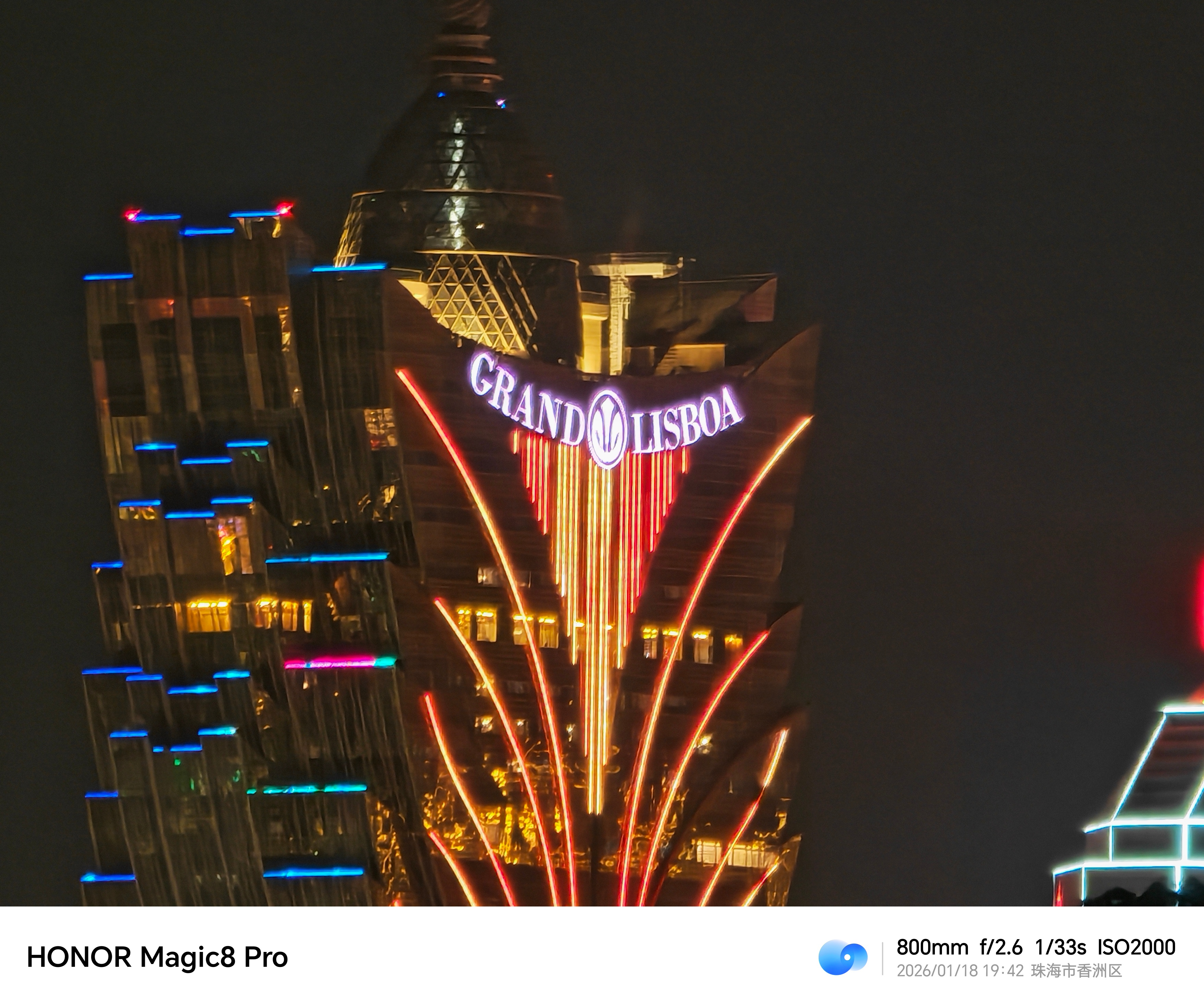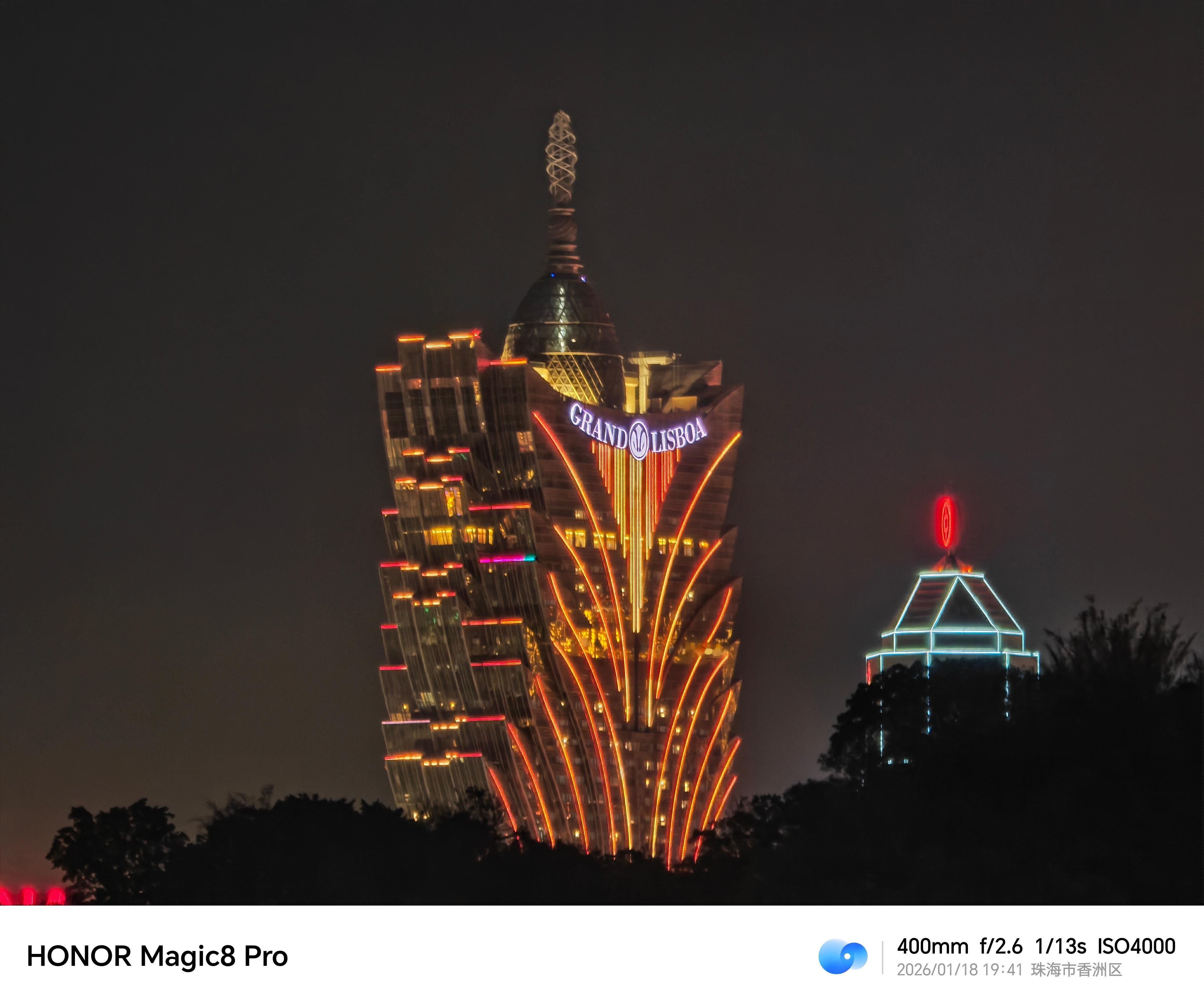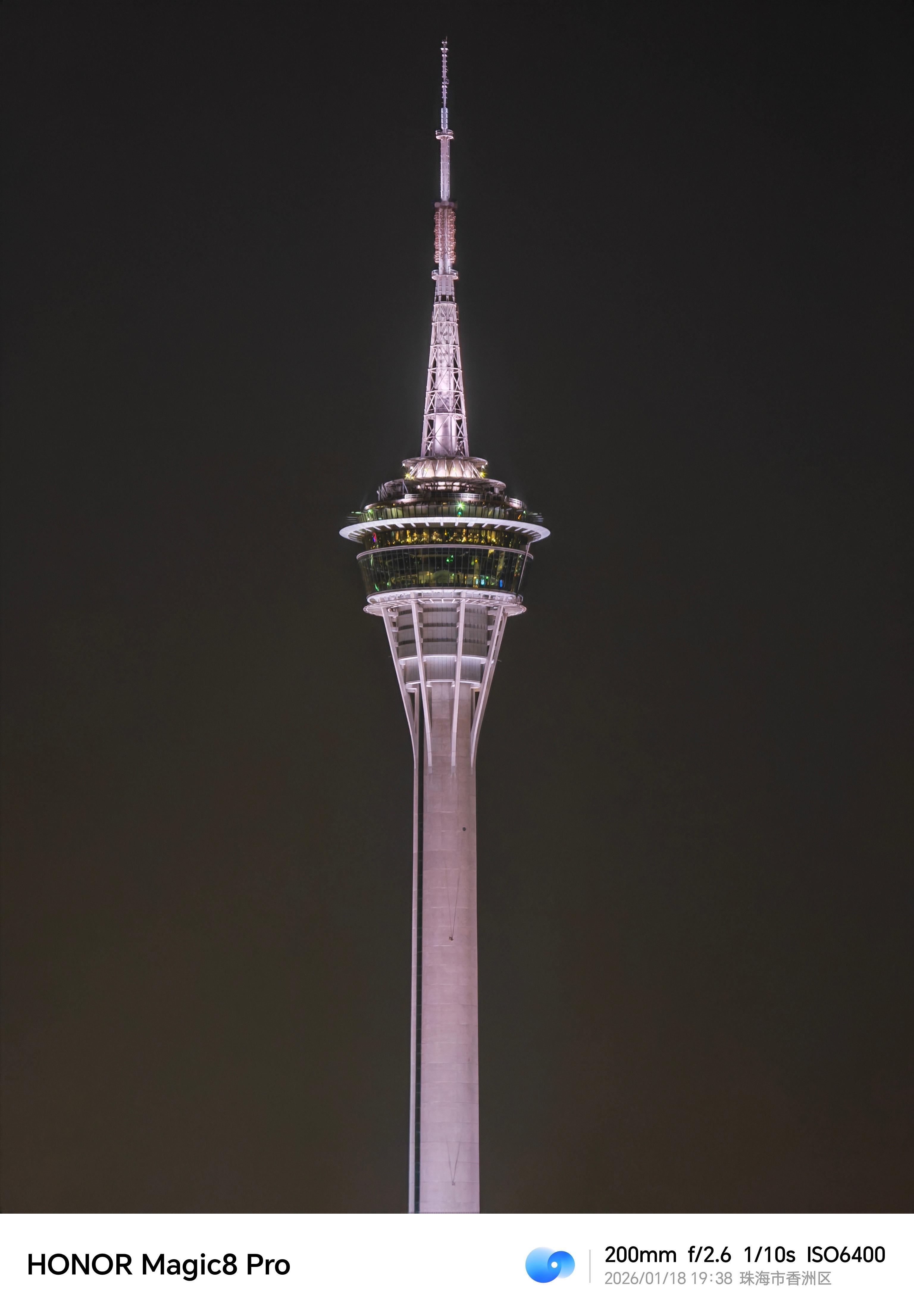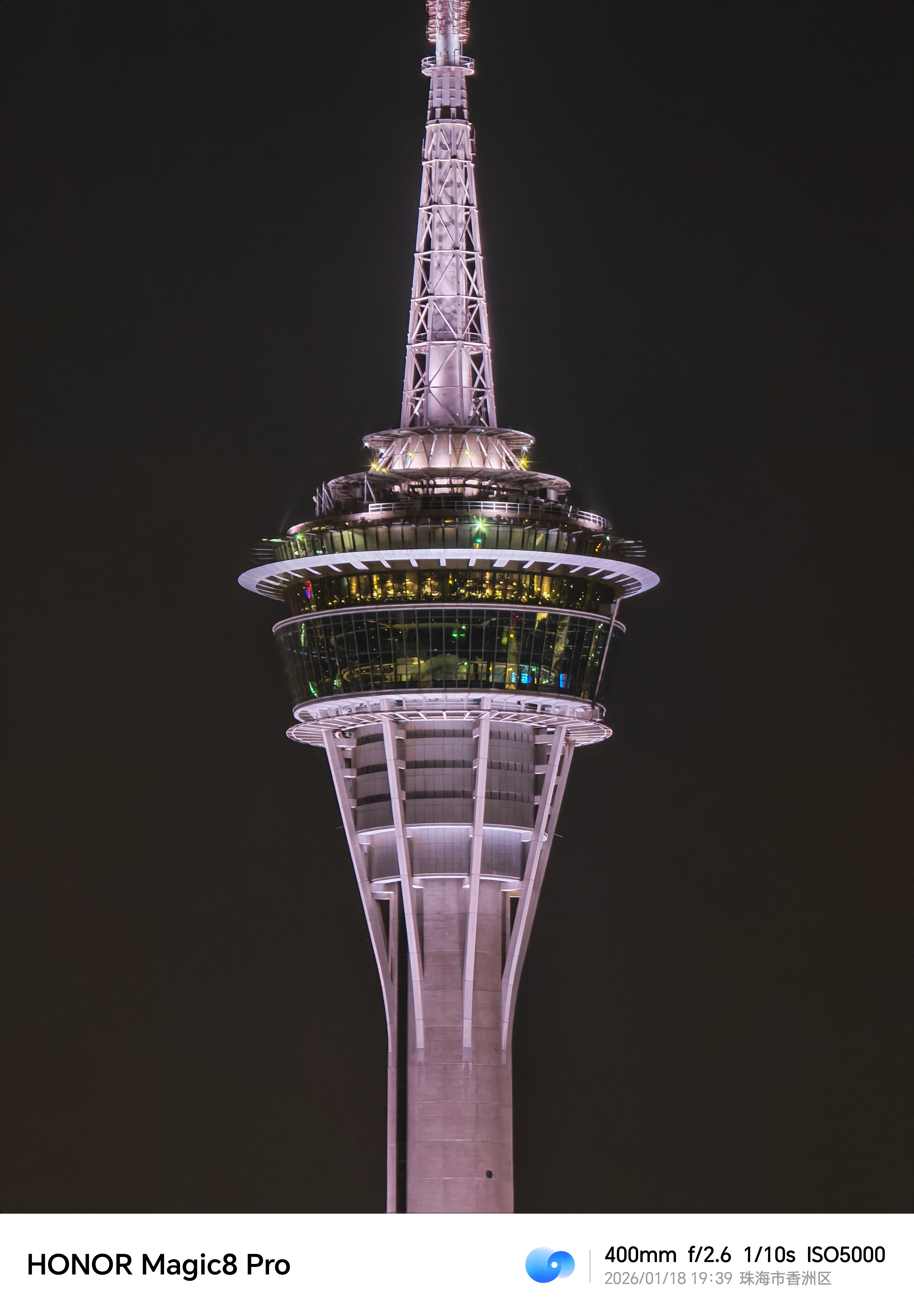 荣耀Magic8 Pro加增距镜真的太能打了,在晚上光线条件不佳的环境下拍澳门塔,800焦段下的实拍效果也能给到惊喜看来以后看演唱会的主力机要换荣耀Magic8 Pro了 珠海