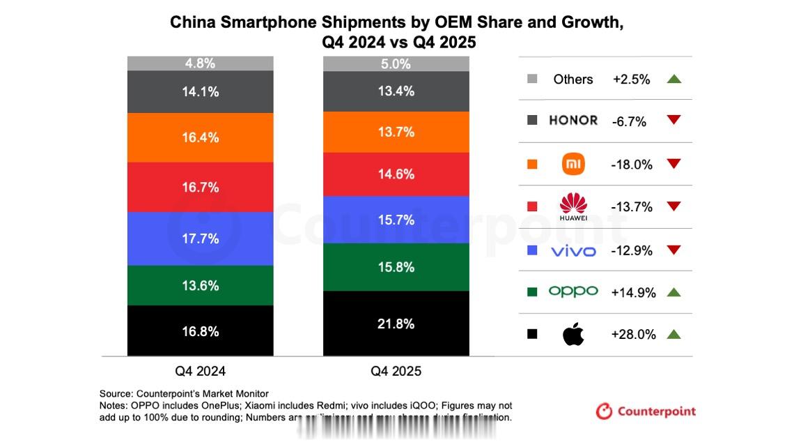 Counterpoint数据和IDC以及Omdia类似,中国市场2025年智能机出货全年同比增长0.6%,25Q4同比下降1.6%。华为夺得年度关键冠军,苹果夺得25Q4季度冠军。手机市场数据分析