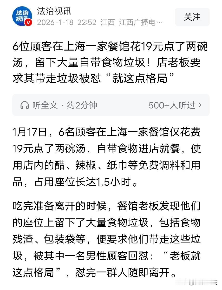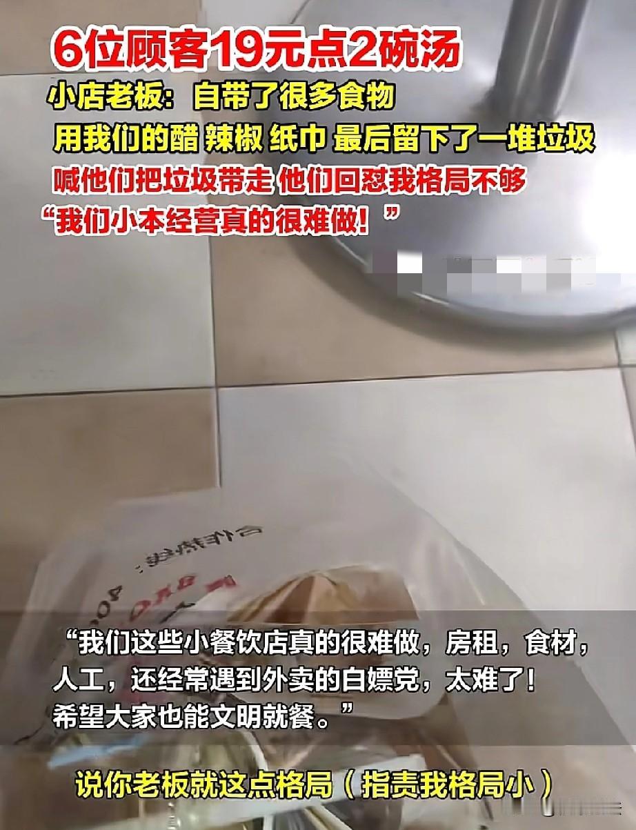 啥都带了,就是忘带脸了!上海,一餐馆来了6个人,花19块钱点了2碗汤,6人拿出自带食物,胡吃海喝长达1个半小时,临走时,桌上、座位上留下一堆乱糟糟的垃圾,老板看不下去,提醒6人,把自带食物垃圾带走,谁料,被一男子怼道:你老板就这点格局?气的老板反手做了一个举动,网友为此吵翻了。 据法治视讯1月18日报道了一件有争议的事件,6人把占便宜演绎的淋漓尽致,最后还怪老板没格局。 事情是这样的,某家餐馆小本经营,这次遇到了6个奇葩顾客,可给老板郁闷坏了。 1月17号,餐馆里,呼呼啦啦一起进来了7个人,坐下后,点了两碗汤,一共19块钱。其中有一位提前离开了,就剩下了6位。 正常来说,6个人喝两碗汤肯定不够,但他们有办法,毫无顾忌的将自带食物旁若无人的拿出来,开始胡吃海喝。 6人吃着自带的食物,喝着花19块钱点的两碗汤还不算,还把店里的醋、还有辣椒,免费调料拿过来吃了。 吃的过程中,纸巾也是一张接一张的抽着用,用完就扔。 估计当时老板看到这一幕也是倒吸一口凉气,但是为了顾客体验也没有作声。 所以,6个人在餐馆里吃着喝着,一坐就是一个半小时,用了老板的碟子,醋、桌上的辣椒…… 终于,这6个人吃饱喝足了,一个个起身准备离开。 老板一看,好家伙,那桌子上那食物残渣到处都是,座位上留下了一堆垃圾,什么包装袋,纸巾,筷子勺子,简直看不下去眼。 于是,老板上前提醒这6人,请你们把自带的食物垃圾带走。 可她万万没想到,6人其中一个男子跳了出来,指责道:你老板就这点格局?! 老板被这突如其来的指责给整懵了,气的说不出话来。 而这一行人怼完老板后,直接扬长而去。 事后,老板越想越生气,她干脆把这事发到网上,吐一吐心中的不快。 其实,老板也不是计较的人,但是遇到这种情况,设身处地的想一想,还是挺气人的。 如果,6人进来后,和老板说一声没地方吃饭,自己带食物占用一会桌椅,消停的吃个饭,老板也会答应的。 可这6人自以为花了19块钱点了两碗汤,就可以理直气壮的占用座位长达1个半小时,就有些过了。 作为顾客应该有意识的文明用餐,吃完饭你不带走自带食物的垃圾,也可以,但你最起码把垃圾入筐吧,这是最起码的素质。 老板也说,经营小店实属不易,支出比较多,像房租、食材,人工啥的都是投入,最怕遇到这种,长时间占着座位的,毕竟影响招待其他新来的客人。 除了这些,老板还表示,经常还会有外卖的“白嫖党”,生意难做,希望大家可以文明就餐。 餐饮服务小店确实不易,起早贪黑的做事赚的都是辛苦钱!希望顾客能理解,多包容,多点善良! 这事在网上引起了大家的讨论,有人说,这老板也是,多大个事,值得发网上吗?是为了出口气,还是提升小店的热度,如果开个店算计这个,算计那个,还开啥店,格局真大。 但也有人表示,理解老板,6个人消费十几块,占座一个半小时,蹭店家的免费物品,不是店家格局小,是那6人素质低。 一般别人跟你谈格局的时候,就是要占你便宜的时候,问题是他自己没有,还非得让你有。 这种人不一定是穷人,真正的穷人都不喜欢去占别人便宜,做过餐饮的人都遇到过。 还有人调侃,听人讲笑话说一个吝啬鬼去饭店吃饭只点了一碗汤,然后从怀里拿出来一张大饼吃了起来。没想到现实生活中还真的有,而且还是六个吝啬鬼凑到了一起。 从法律方面来说,在顾客在餐馆消费,本来就有保持就餐环境整洁的义务,就像在自己家里吃饭,吃完得收拾桌子一样。 老板要求他们带走自带食物产生的垃圾,这是合理的要求。 可6名顾客不仅拒绝,还辱骂老板说老板“就这点格局”,这明显是不对的。 《民法典》第1165条规定:行为人因过错侵害他人民事权益造成损害的,应当承担侵权责任。 顾客这种行为如果给老板造成了精神上的伤害或者其他损失,比如因为被辱骂老板,或者长时间占座位导致其损失,顾客是有过错的,老板可以要求他们承担侵权责任,像赔礼道歉、赔偿精神损失费啥的。 另外,顾客自带食物在餐馆就餐,使用店内免费调料和用品,餐馆老板能否禁止顾客这种行为呢? 《消费者权益保护法》第9条规定:消费者享有自主选择商品或者服务的权利。 顾客自带食物,只要没有违反法律法规,也没有影响餐馆的正常经营秩序,他们是有权利这么做的。 对于使用店内免费调料和用品,如果餐馆没有提前明确告知顾客不能使用,那顾客使用也是合理的。 不过呢,餐馆老板要是觉得顾客自带食物和使用免费调料等行为给自己带来了损失,比如成本增加,他也可以和顾客好好商量,在合理合法的前提下,和顾客约定一些规则,像适当收取一些费用啥的。 但要是老板直接禁止顾客自带食物和使用免费调料,没有合理的依据,这可能就侵犯了消费者的自主选择权,是不符合法律规定的。