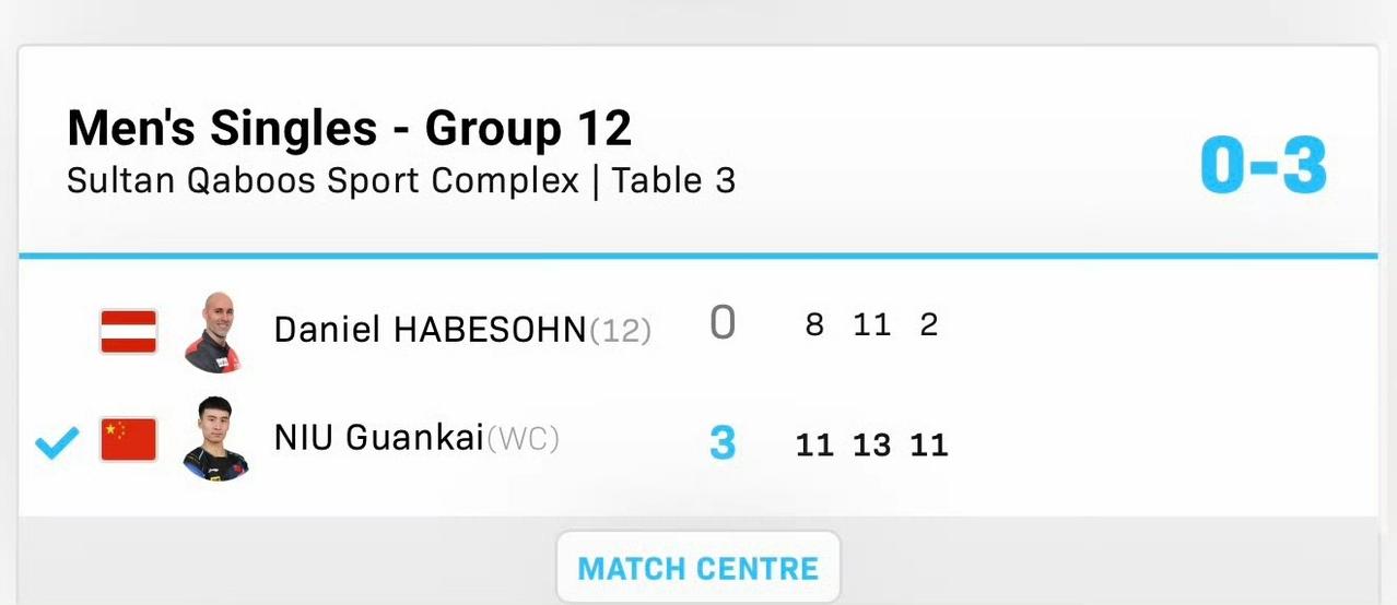 徐海东🇨🇳首场获胜! 牛冠凯🇨🇳首场获胜! 国乒男队的状态好像一下子比女队好起来了[捂脸], 刚刚,两场2026WTT常规挑战赛马斯喀特站男单资格赛小组循环赛结束了, 姜还是老的辣,徐海东🇨🇳3-1战胜队友李和宸🇨🇳,四局比分为:13-11,4-11,11-4,11-5。 很遗憾,徐海东和李和宸分在了一个小组,而一个小组只有一个晋级正赛的名额,他俩的关键任务就是干掉摸鞋哥阿拉米扬🇮🇷[奋斗]! 另一场比赛中,穿着去年发的比赛服,牛冠凯🇨🇳直落三局,3-0击败奥地利名将哈贝松🇦🇹,三局比分为:11-8,13-11,11-2。 牛冠凯(图三)第二局做的真不错,本来8-10落后,结果他顽强追回来了,先拿到局点的哈贝松被翻盘,心态一下子崩溃了[捂脸]。