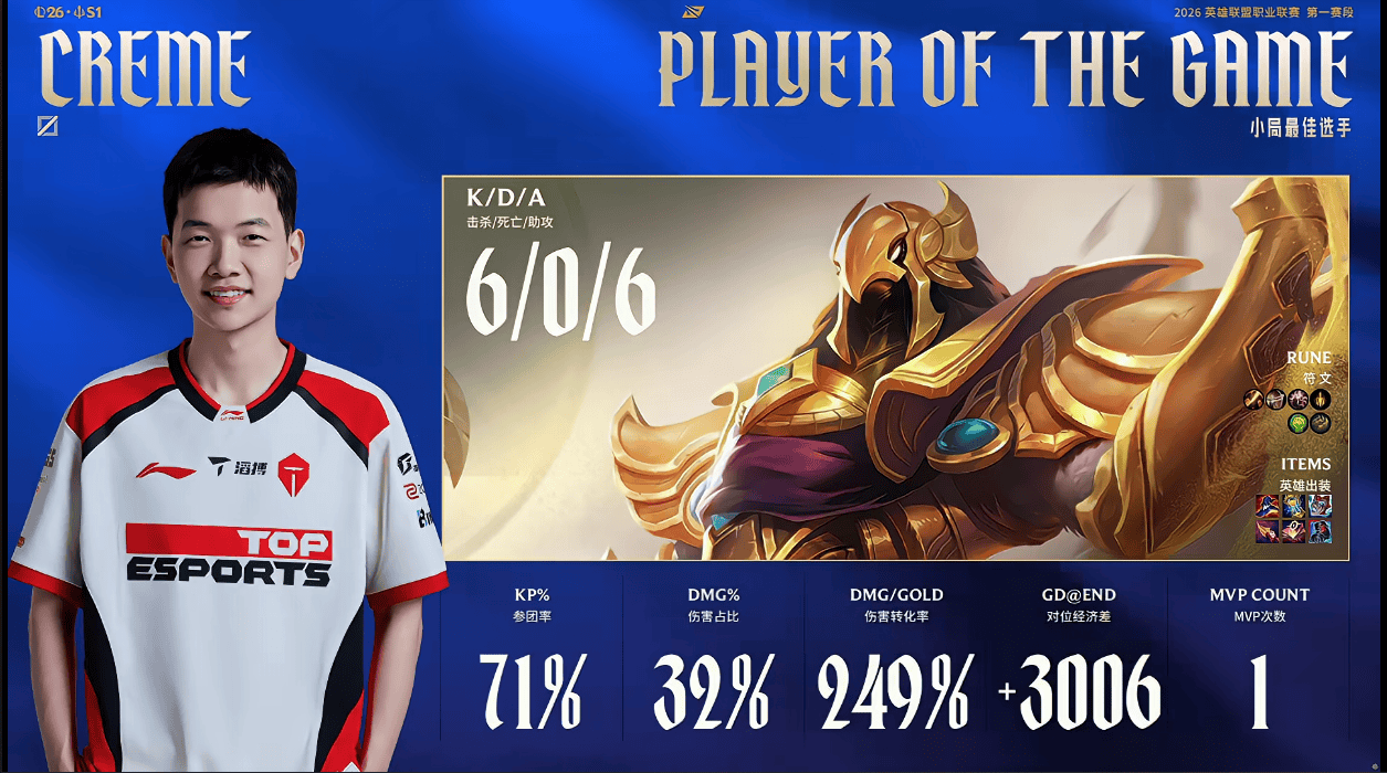 Creme沙皇打出6/0/6战绩,斩获TES对阵WBG第一局MVP