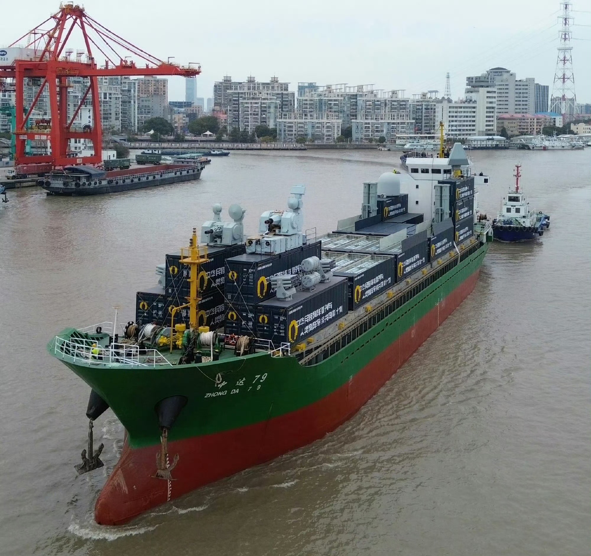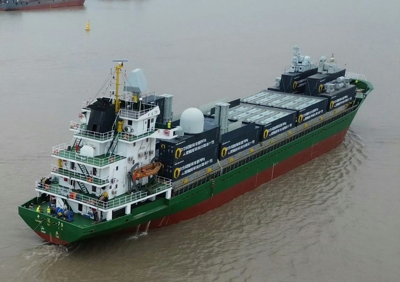 “中达79”武装集装箱轮出港海试!船头有两套近防系统。甲板上一共有15个集装