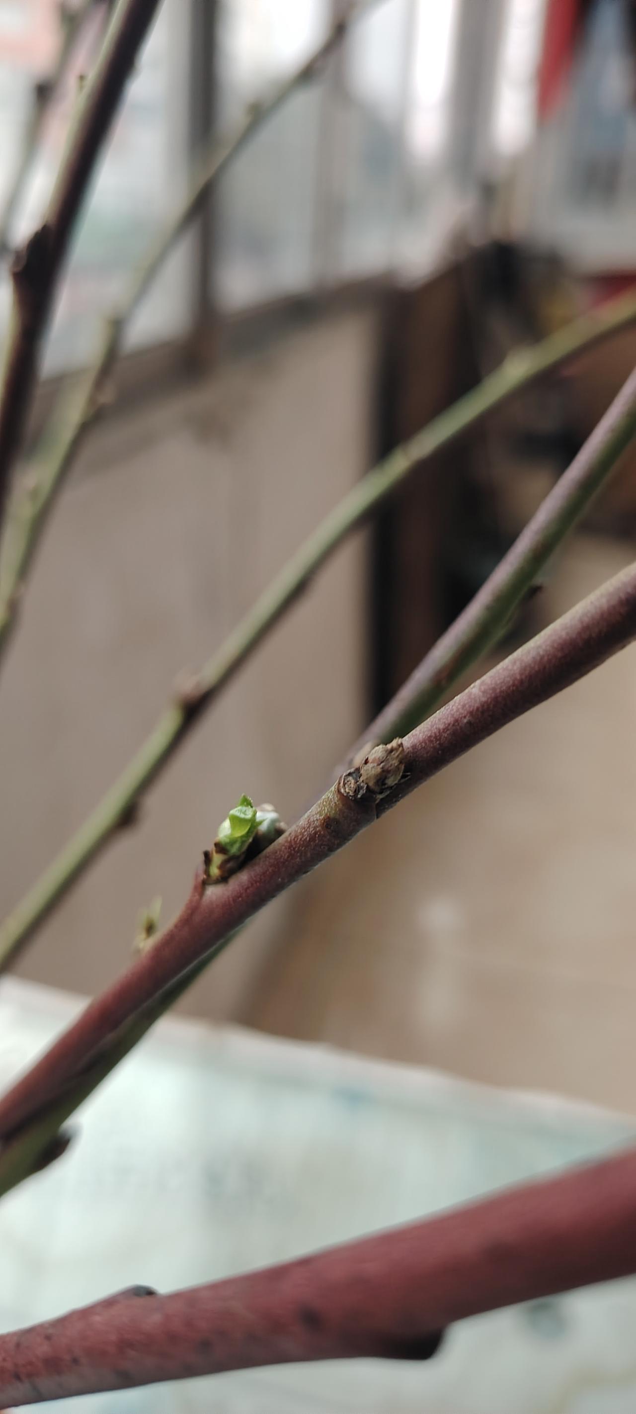 今天腊月初一,我们这里下雪了,雨夹雪。妈叫我把腊梅枝放室内去,恐怕冻死了。我说腊梅喜冷,傲雪开花的,不用挪。而且,我的一捆腊梅枝条稀稀拉拉竟抽出了些绿色的嫩芽,仔细看长得是叶子,绝对不是花苞,那它到底会开花吗?人说拼多多上都是假货,我还是希望奇迹发生,在我努力细心呵护下能开花,哪怕一朵也行。瓶里的水一个星期没换了,根部有些粘乎乎的液体,在水龙头下冲洗了一遍,瓶子里也冲洗干净,再倒入凉白开加液养营。寒冬腊月我用真诚能换来花开吗?