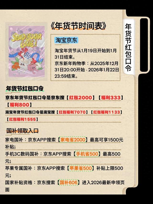 2026年货节红包口令是淘宝搜[天降红包3636]京东搜[福利333][福利800]淘宝年货节定档1月19日零点正式开卖,1月31日24点收官,整整13天的狂欢期,红包、满减、直降轮番轰炸,错过一天可能就亏几百!你是不是也在纠结:到底哪天最便宜?京东和淘宝谁更划算?红包口令是啥?别急,这篇攻略把两个平台的活动节奏、史低价节点、隐藏福利一次性扒光,照着抄作业,省下一台手机钱不是梦!