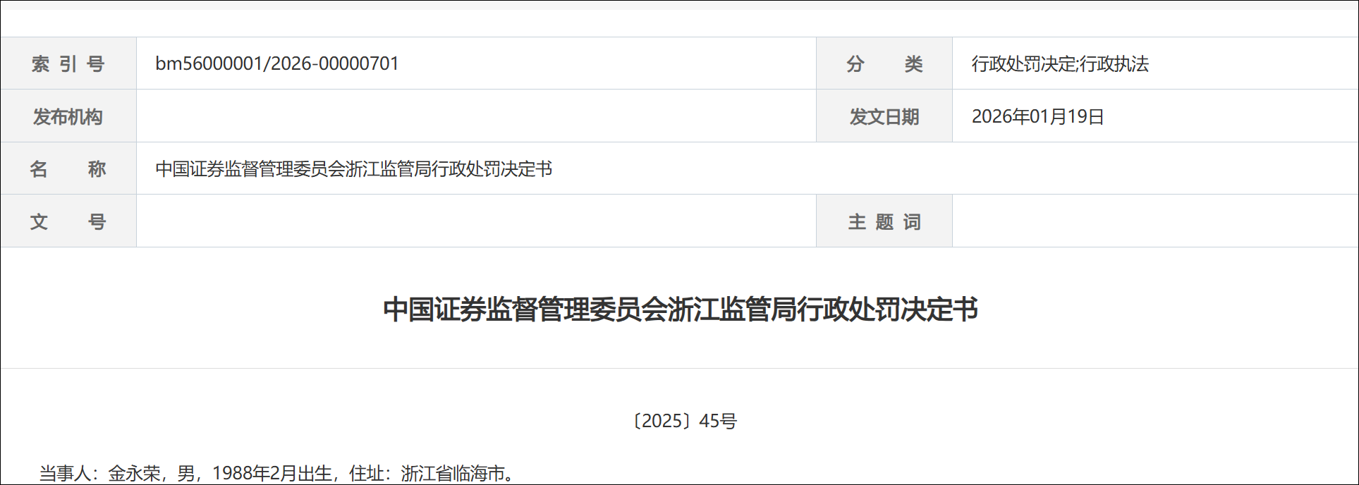 1月19日,浙江证监局发布行政处罚决定书,2024年9月2日至2025年4月16日,当事人金永荣知晓其荐股行为具有影响力,在其雪球“金浤”账号公开发文评价、推荐“启迪环境”“路维光电”“光华科技”等32只股票,并控制账户组在荐股后的当日或次日进行大量反向卖出交易。