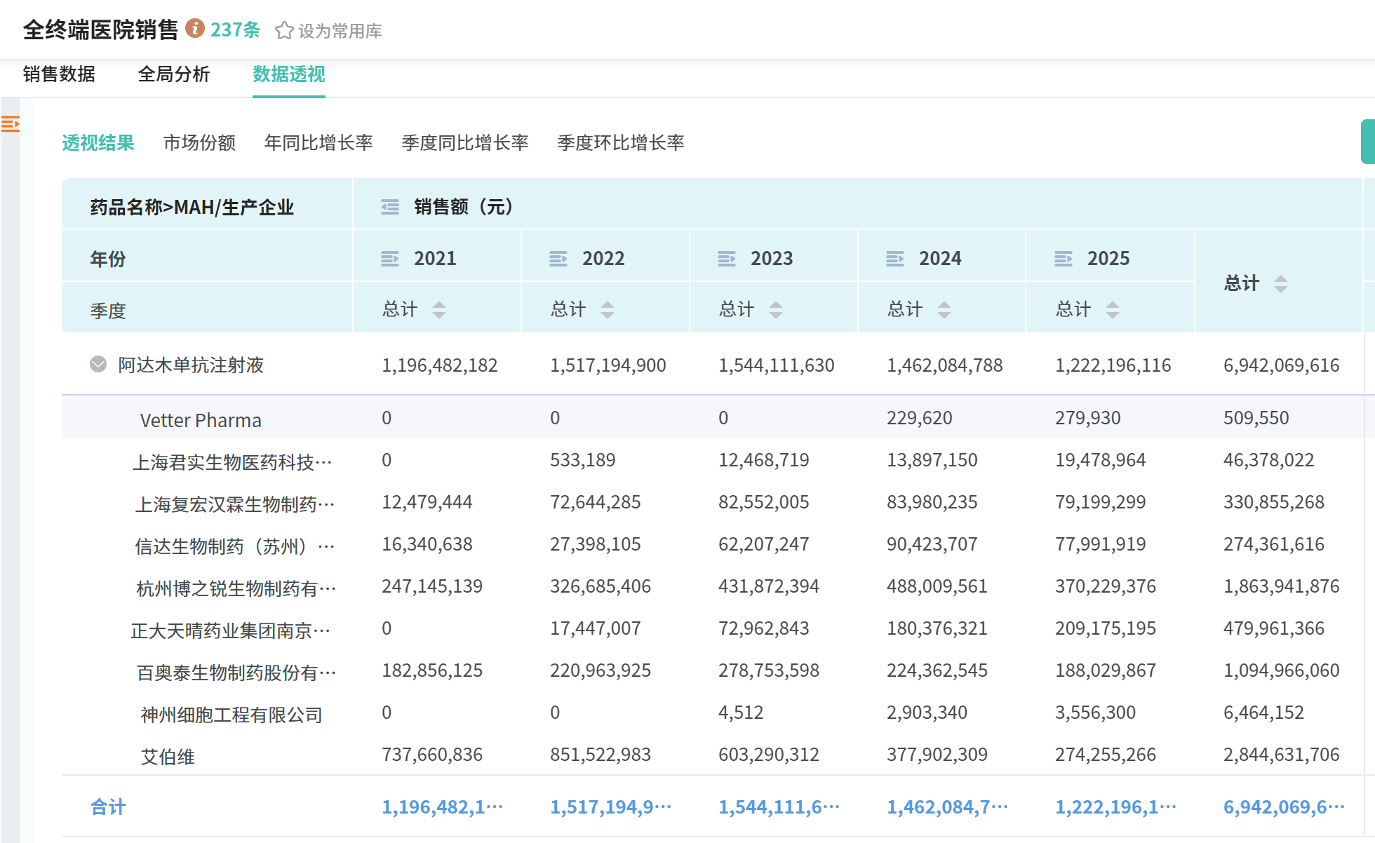 不过,博锐生物却是在国内把阿达木单抗卖得最好的企业。虽然博锐生物的安健宁®甚至不是首仿产品。它的获批时间晚于首仿百奥泰的格乐立®。而据摩熵医药数据库,2021年起,安健宁®就一直是国内仅次于原研药修美乐®的销冠;2024年之后,安健宁®超越修美乐®成为了本土销售额最高的阿达木单抗。