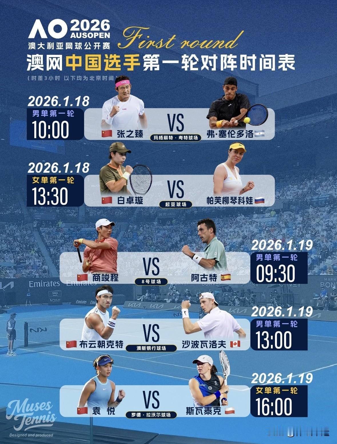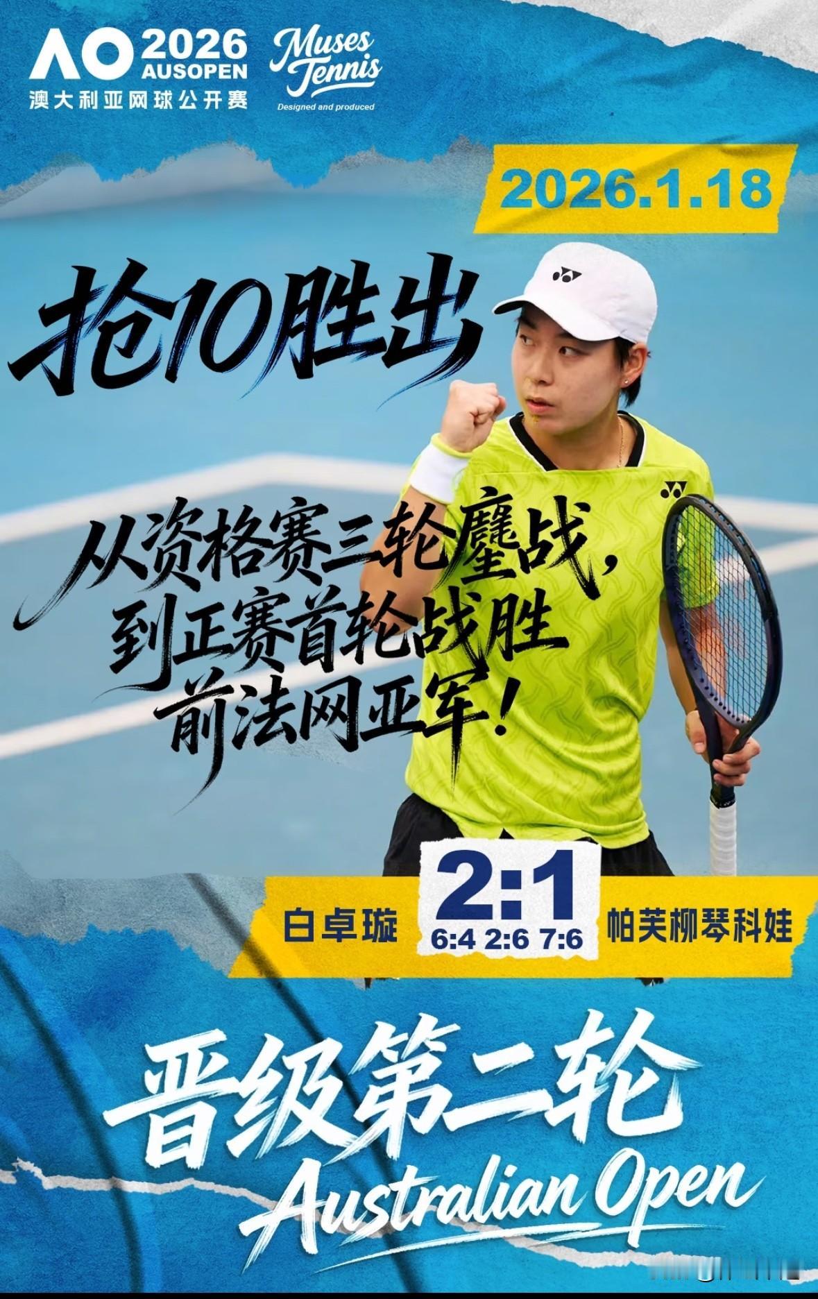[比心][比心][比心]中国选手已出战五人@白卓璇、商竣程闯入64强[赞][赞][赞] 2026年澳网首轮中国选手的表现有喜有忧。 首日,张之臻作为中国男网希望之星,与阿根廷选手塞伦多洛对决。原本他有逆转机会,可比赛中慢热,首盘3 - 6告负,还遭遇观众干扰,打乱发球节奏,第二盘抢七0 - 7惨败,因反手失误遗憾出局,不过获10个积分和15万澳元奖金,后续将出战男双。而白卓璇从资格赛突围,爆冷击败俄罗斯名将晋级,成焦点。 次日,商竣程、布云朝克特、袁悦出战。商竣程凭保护排名对阵西班牙老将阿古特,成功晋级。袁悦挑战世界第二斯瓦泰克、布云朝克特持外卡战21号种子沙波瓦洛夫,虽未晋级,但表现也不错。期待他们后续比赛再创佳绩!