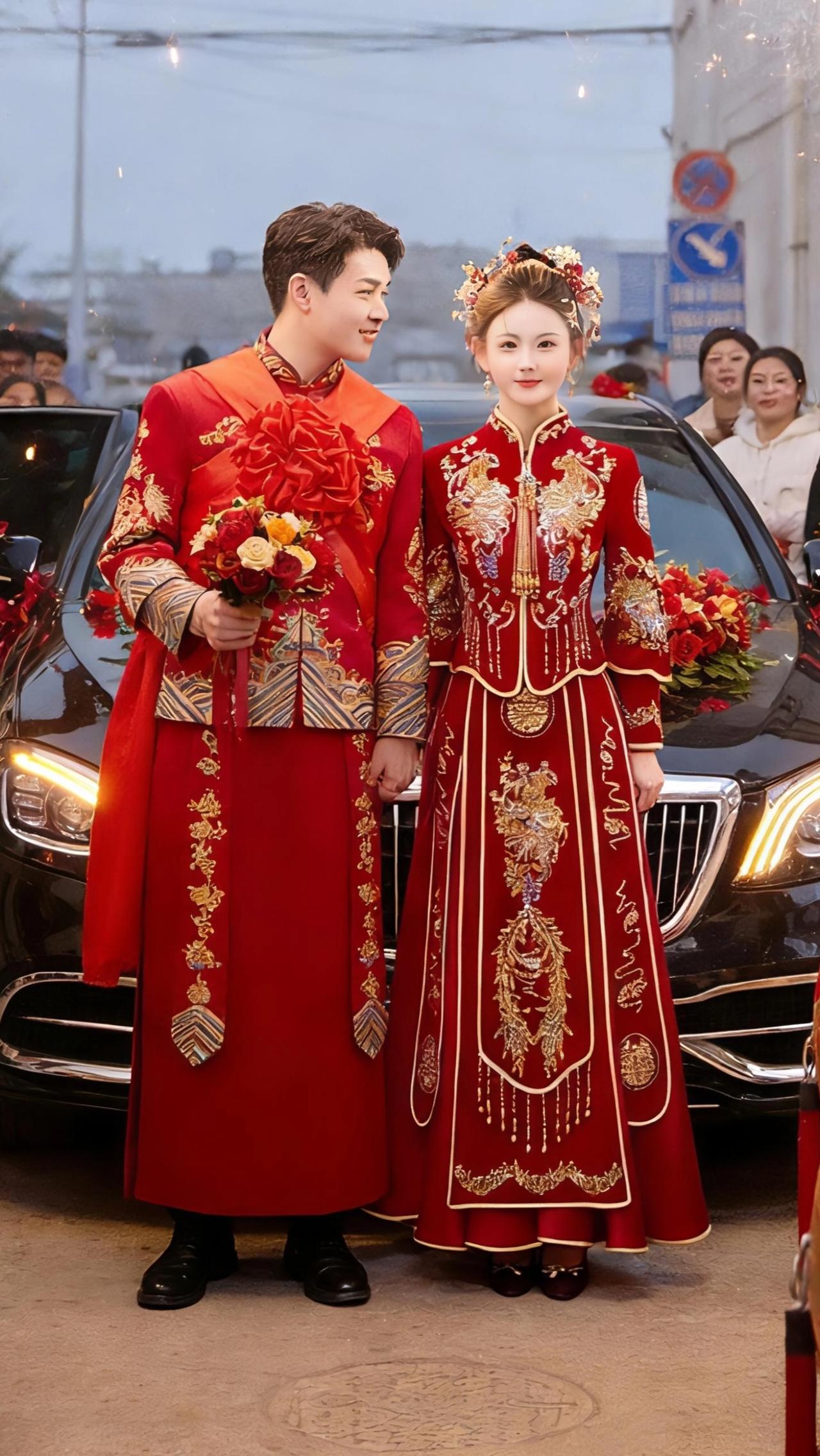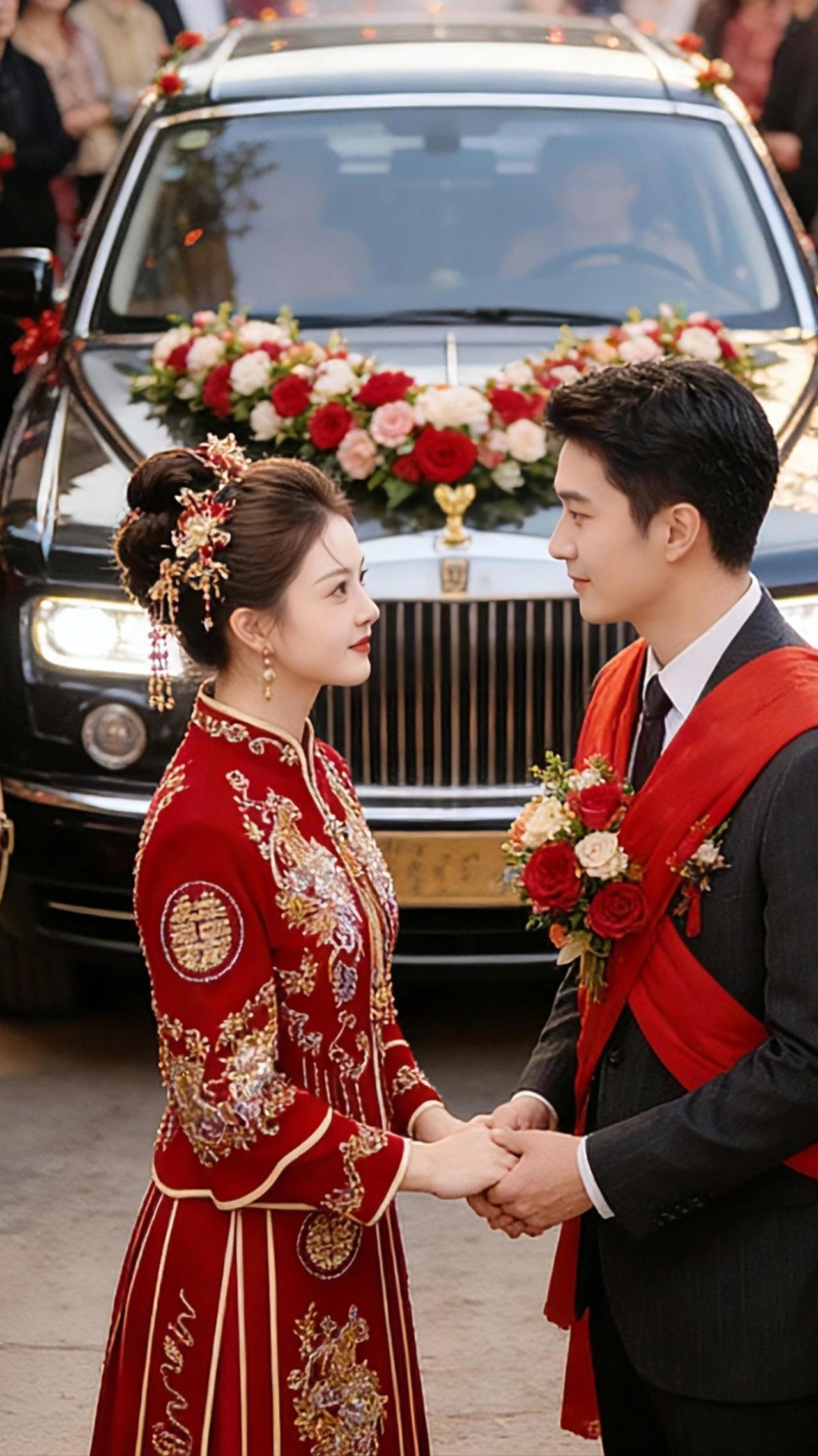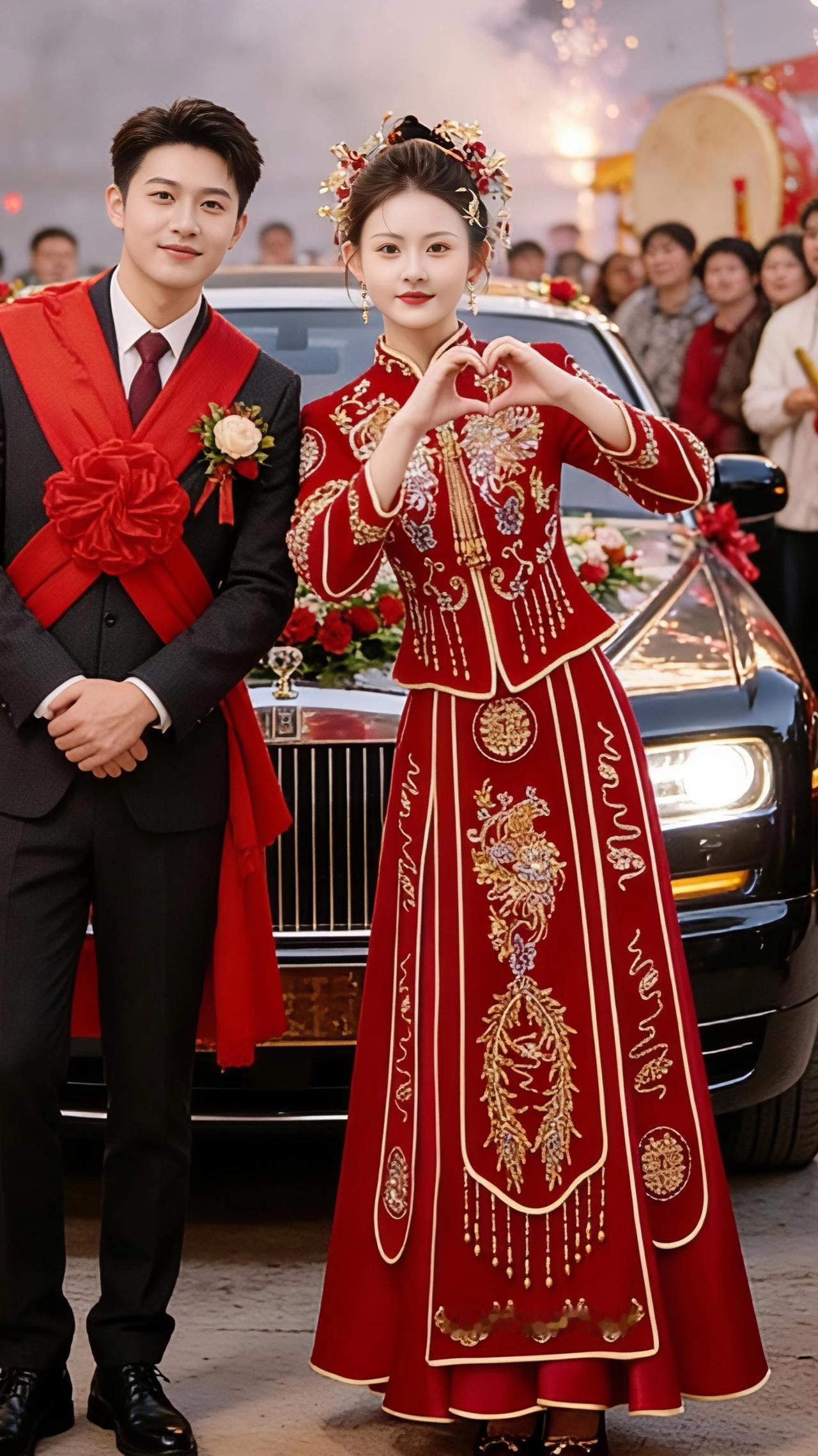 红妆十里,奔赴此生 当清晨的第一缕阳光掠过巷口,那辆缀满玫瑰与绣球的黑色劳斯莱斯,已静静等候在青石板路上。红绸缠绕的车身上,金色的欢庆女神标在晨光里漾着温柔的光,像极了此刻她眼底的星芒。 她身着一袭正红秀禾服,金丝银线绣就的龙凤纹样在裙摆流淌,行走间流苏轻晃,发出细碎的声响。发间金步摇随颔首的弧度轻颤,与耳坠的微光交相辉映。他一身笔挺西装,胸前斜披的红绸带与她的嫁衣遥遥呼应,手里紧攥的花束,红玫瑰热烈得如同他此刻的心跳。 两人在车前驻足相握,目光交汇的瞬间,周遭的喧嚣都成了模糊的背景。她微微屈膝提起裙摆,与他并肩走过红毯,鞭炮声在身后炸出漫天碎金,亲友的笑语混着锣鼓声,在老巷里铺陈出最鲜活的人间烟火。 她抬手向人群致意,指尖的金饰在阳光下熠熠生辉;他含笑望着她,眼底盛着化不开的温柔。待她转身比出心形的刹那,快门声定格下这帧浪漫——红妆似火,良辰似锦,往后的岁岁年年,他们都将这样,手牵手,走向满是繁花的远方。 中式婚礼 感受一下穿婚纱的感觉 看看自己穿上婚纱的样子 秀出新国风