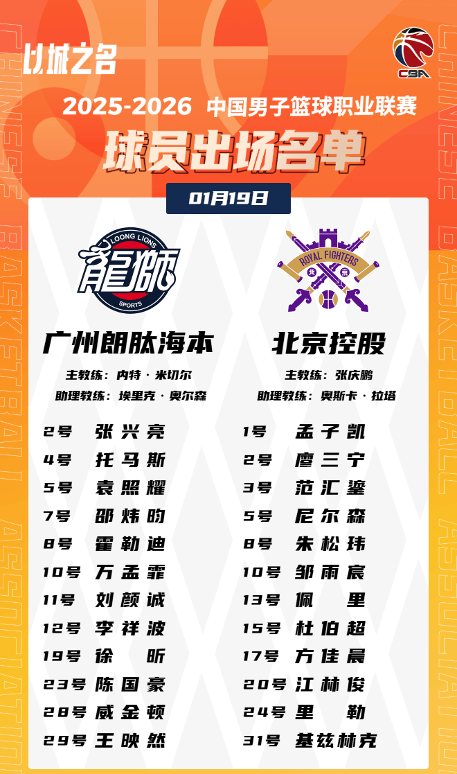 虎扑01月19日讯今晚CBA常规赛,北控对阵广州的大名单已经公布。