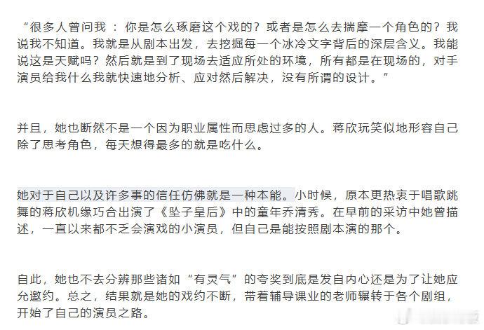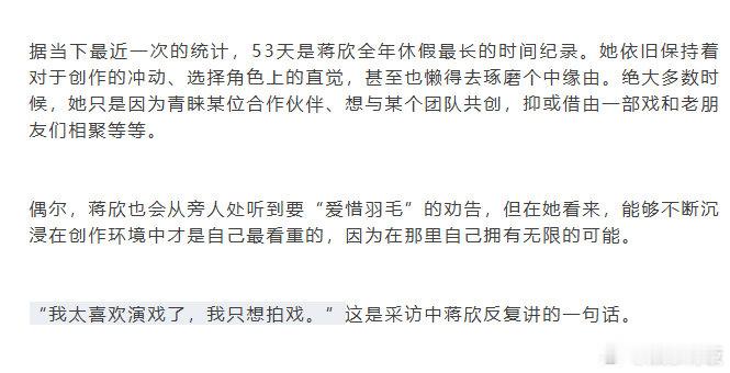 蒋欣全年休假最长纪录是53天蒋欣每天除了思考角色就是吃什么 《InStyle优家》采访曝光,据当下最近一次的统计,53天是蒋欣全年休假最长纪录。蒋欣还玩笑似地形容自己除了思考角色,每天想得最多的就是吃什么。