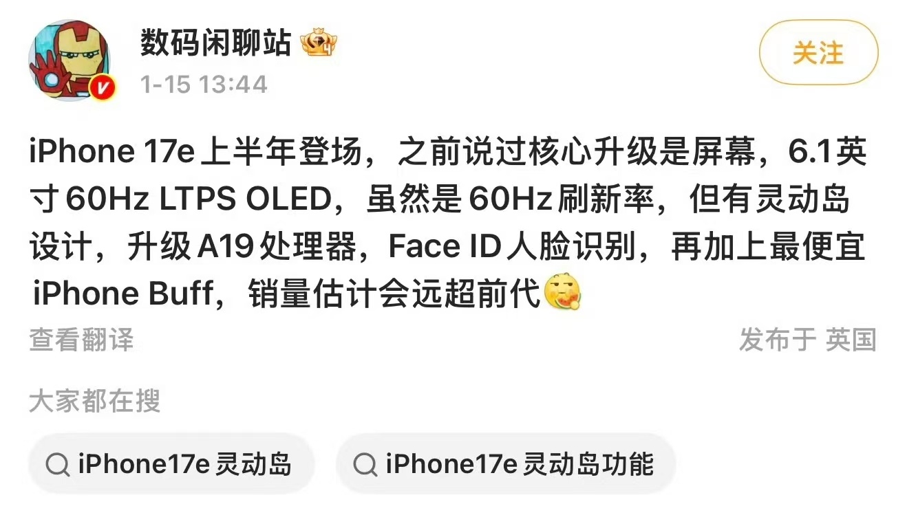 苹果的性价比神机 iPhone 17e 要来了?预计 2 月亮相,599 美元起,还直接 256GB 起步,还真有点东西。说真的,毕竟对于不玩手游、日常就是刷社交、拍拍照的人来说,60Hz 真的够用了,流畅度完全不用担心。苹果这是把“精准挤牙膏”玩明白了,就看 2 月发布后,大家会不会为了“最便宜的灵动岛 iPhone”买单了。iPhone