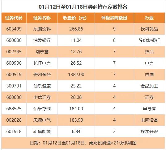 据南财投研通数据,1月12日至1月18日有191家上市公司得到券商推荐,其中贵州茅台等获得7家推荐。
