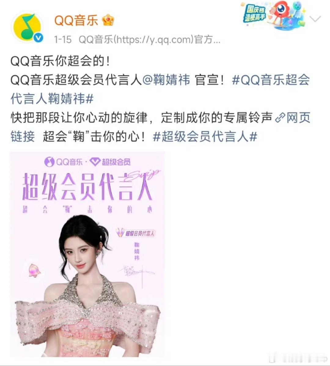鞠婧祎2026火力全开了吧,才开年半个月就宣了3个商务,全球代言人➕qq音乐超级